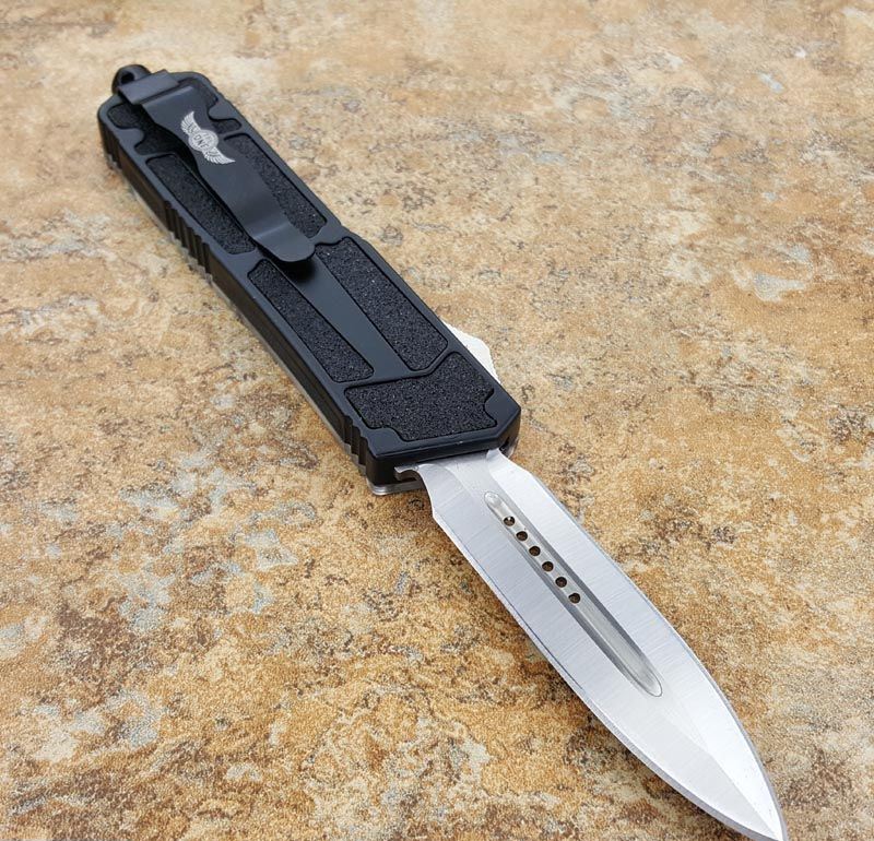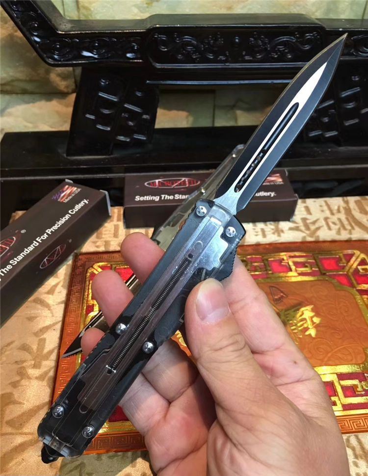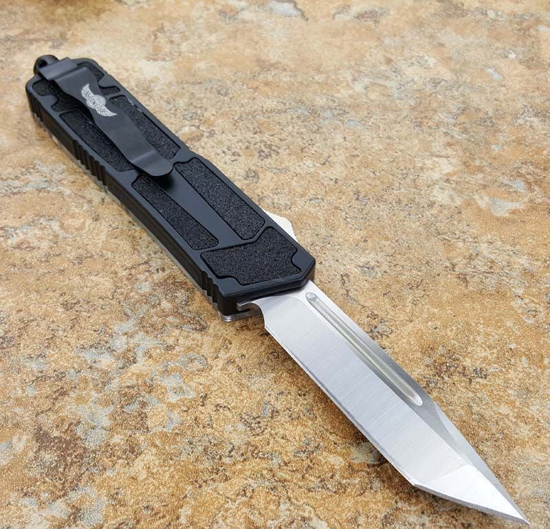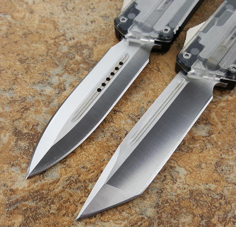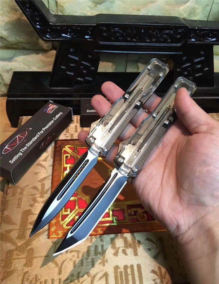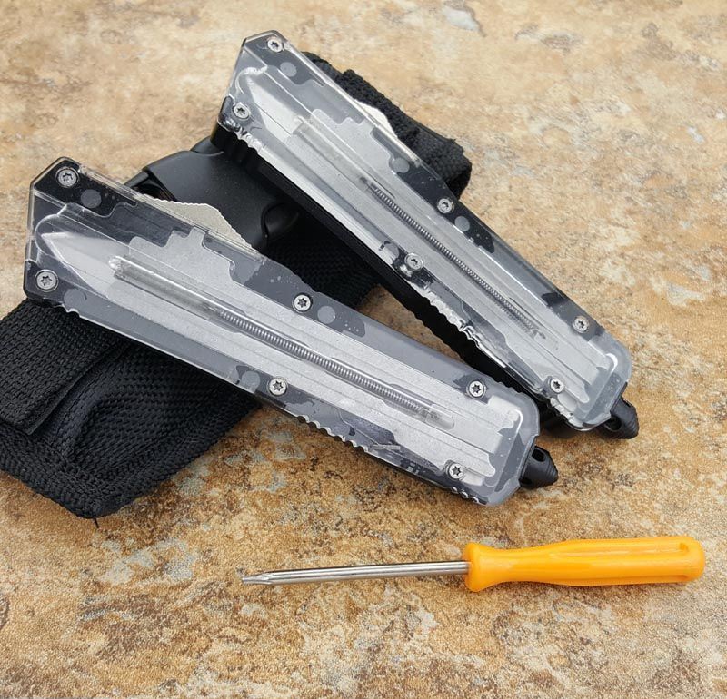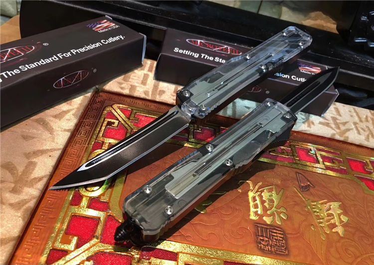 微技术圣甲虫直跳刀透视款 全长:21.3cm(含尾锥长度) 刃长:8.5cm 刃厚:3.2mm 刃材:440 硬度:57HRC 重量:185g 表面:缎光 柄:合金 刀鞘:尼龙