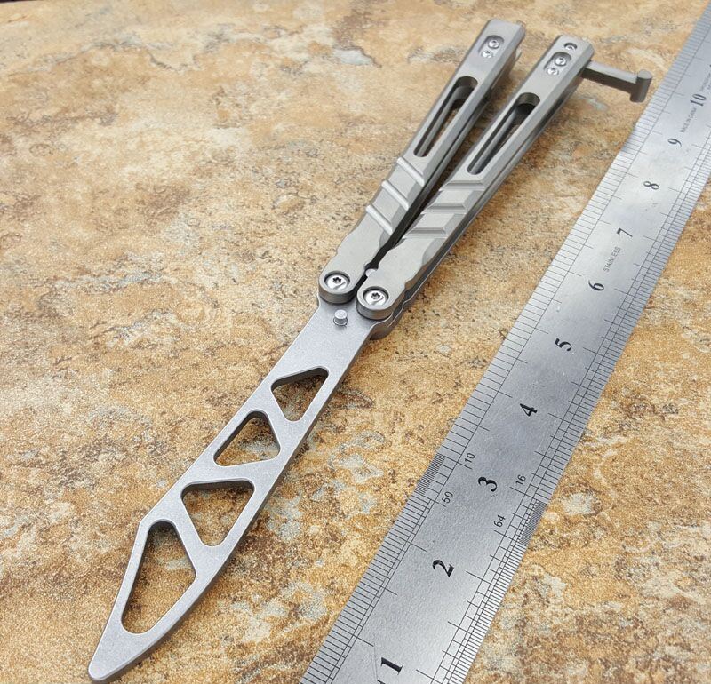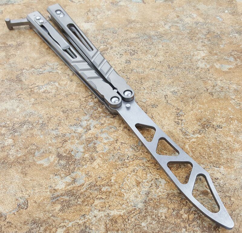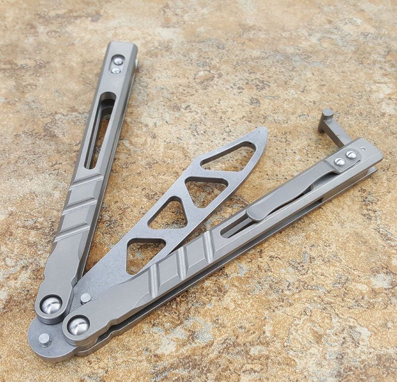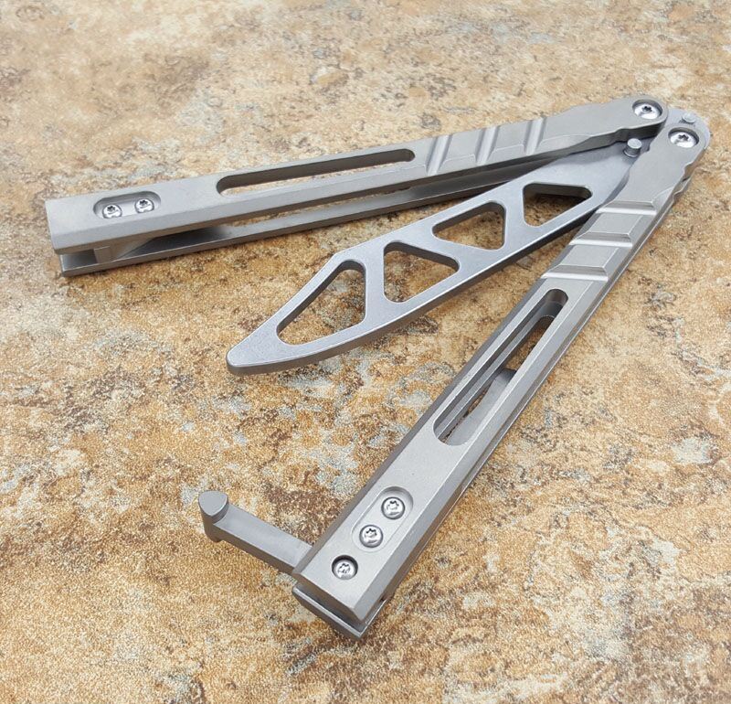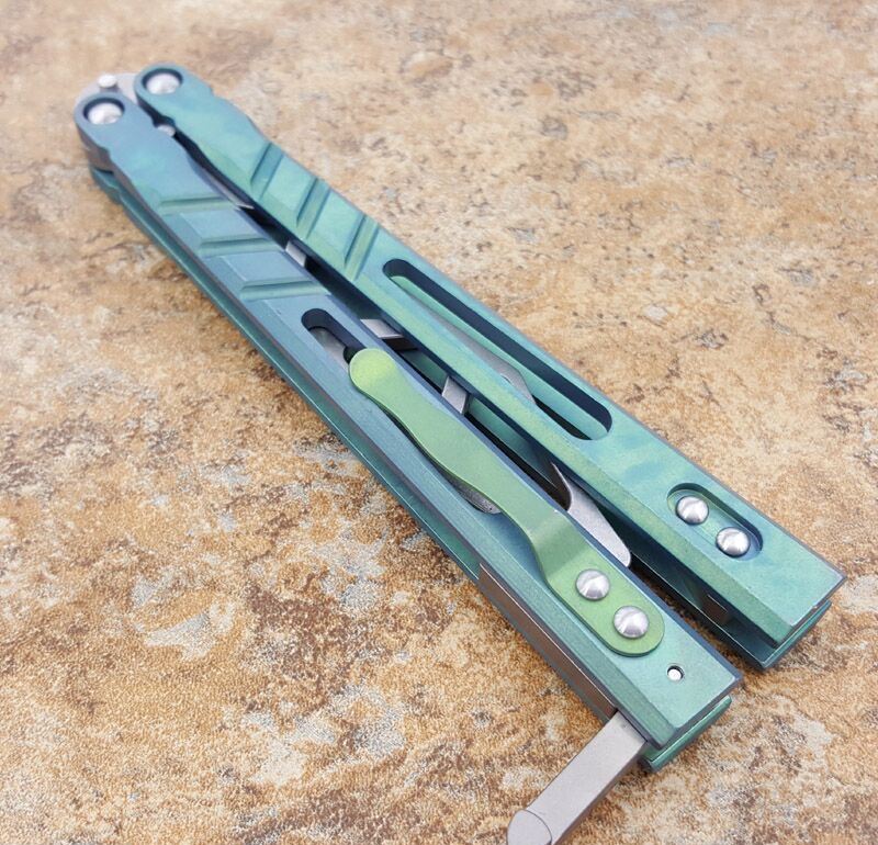the one钛柄AB蝴蝶甩刀(钢本色柄\绿柄练习刃) 全长:254MM 刃长:114MM 开刃长:107MM 刃厚:3.5MM 刃材料:D2 刃型:tanto 柄长:140MM 柄厚:14MM 柄材料:钛柄 柄颜色:钢本色/绿, 柄内衬:钛 钛柄AB系列,bushing轴套系统,搭配钛内衬,钛合金手柄。转动非常顺畅,D2刃材,数控精磨