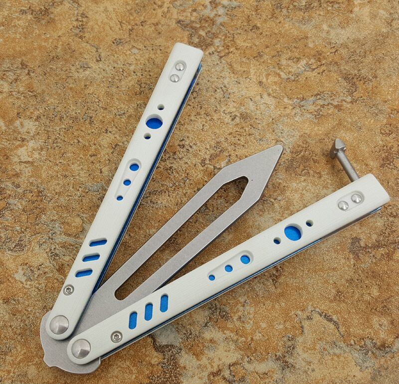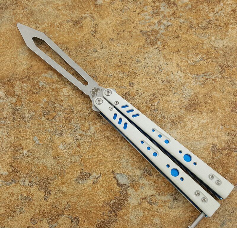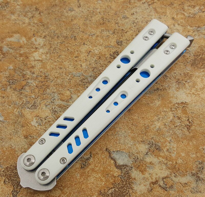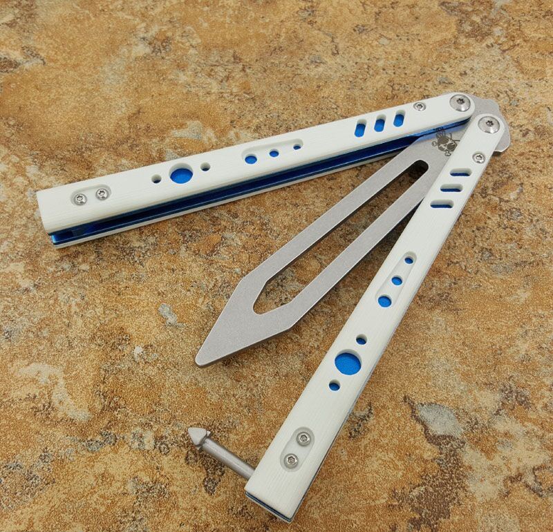 the one BRS蝴蝶甩刀(白兰练习刃) 全长:254MM 刃长:114MM 开刃长:107MM 刃厚:3.5MM 刃材料:D2 刃型:tanto 柄长:140MM 柄厚:14MM 柄材料:G-10 柄颜色:白兰 柄内衬:钛 重量:150克 BRS系列,bushing轴套系统,搭配钛内衬,G10轻质高强手柄,重量只有150克。转动非常顺畅,D2刃材,数控精磨