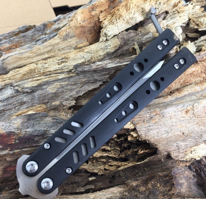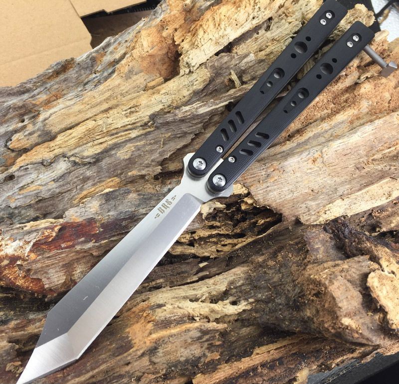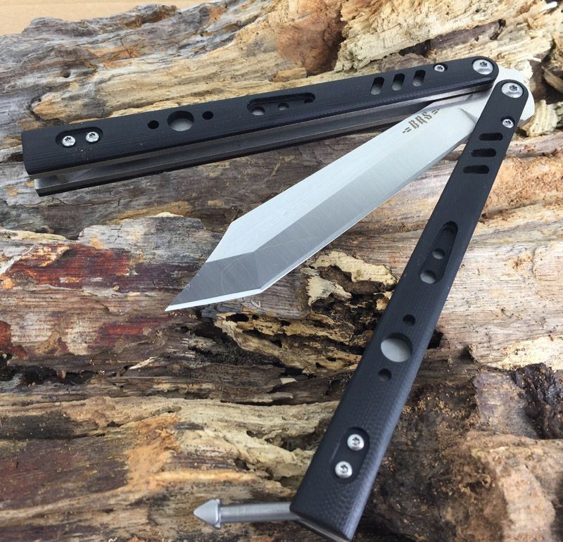 the one BRS蝴蝶甩刀(黑灰) 全长:254MM 刃长:114MM 开刃长:107MM 刃厚:3.5MM 刃材料:D2 刃型:tanto 柄长:140MM 柄厚:14MM 柄材料:G-10 柄颜色:黑/灰 柄内衬:钛 重量:150克 BRS系列,bushing轴套系统,搭配钛内衬,G10轻质高强手柄,重量只有150克。转动非常顺畅,D2刃材,数控精磨