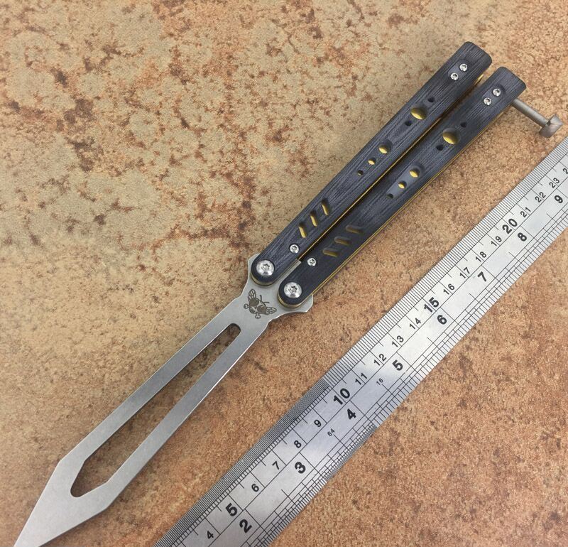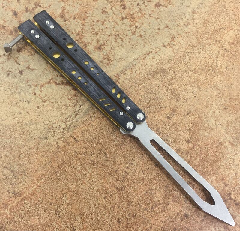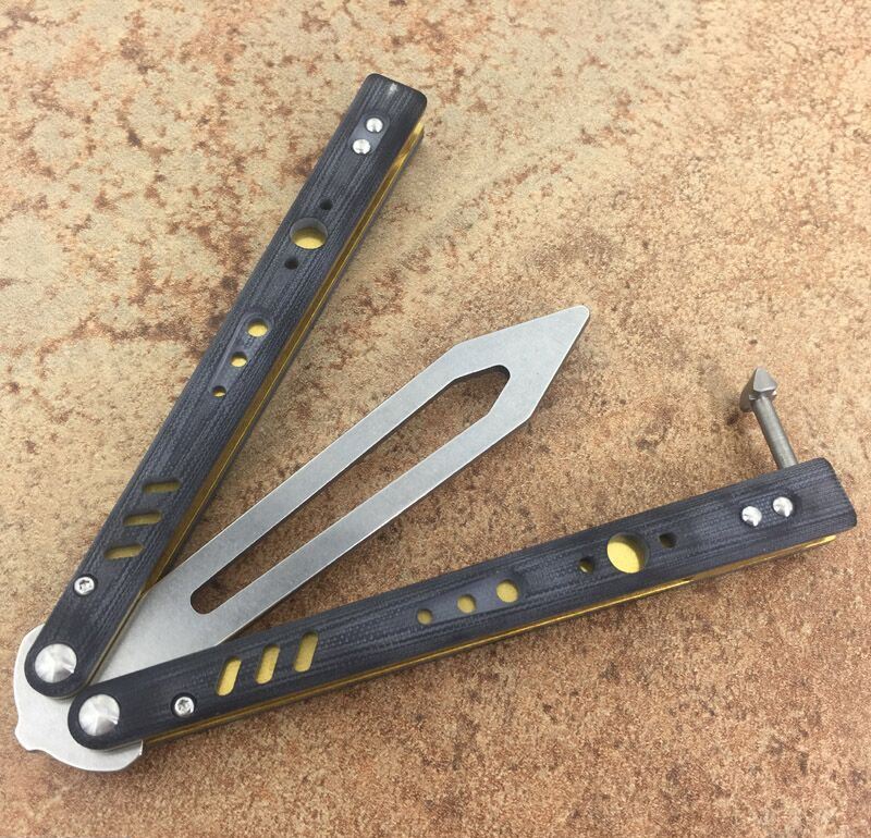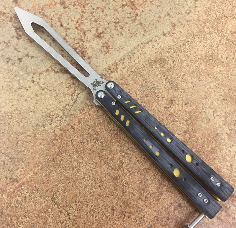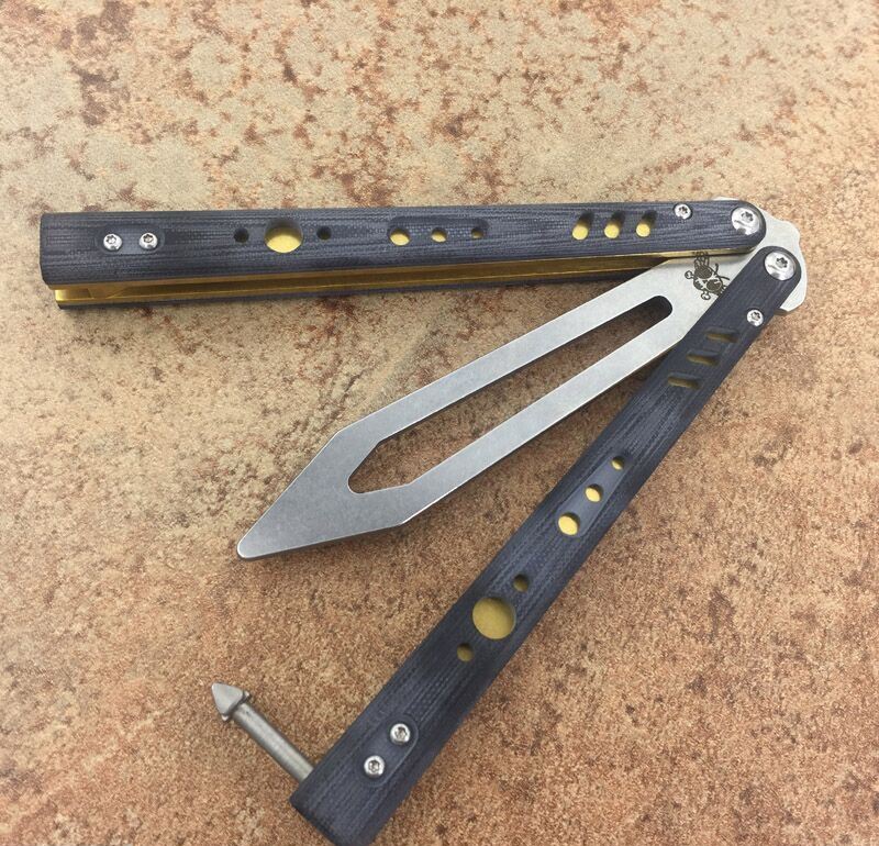 the one BRS蝴蝶甩刀(黑金练习刃) 全长:254MM 刃长:114MM 开刃长:107MM 刃厚:3.5MM 刃材料:D2 刃型:tanto 柄长:140MM 柄厚:14MM 柄材料:G-10 柄颜色:黑/金 柄内衬:钛 重量:150克 BRS系列,bushing轴套系统,搭配钛内衬,G10轻质高强手柄,重量只有150克。转动非常顺畅,D2刃材,数控精磨