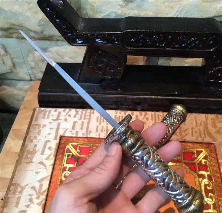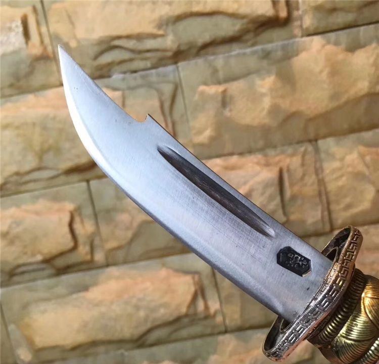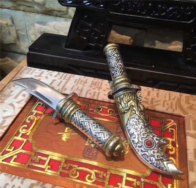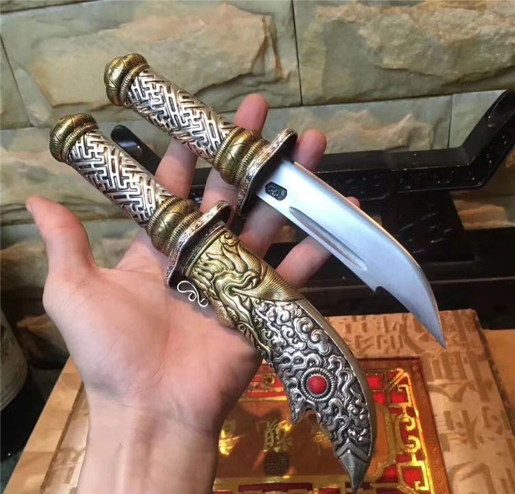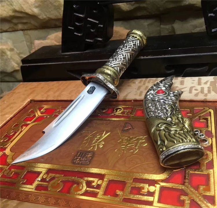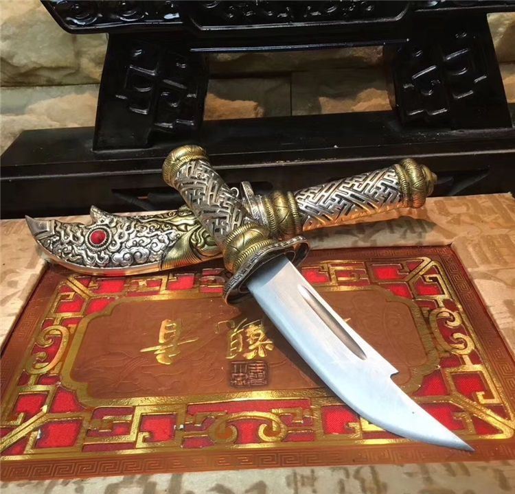 拉牧藏刀小关公 全长:23cm 刃长:12cm 刃宽:2.5cm 柄长:10cm 刃厚: 0.5cm 重量:180g 硬度:58-61HRC 性能:砍铁剁铜 柄材:白铜、黄铜 护手:白铜 刃材:弹簧钢 鞘材:白铜、黄铜 工艺:藏族民间工艺制作