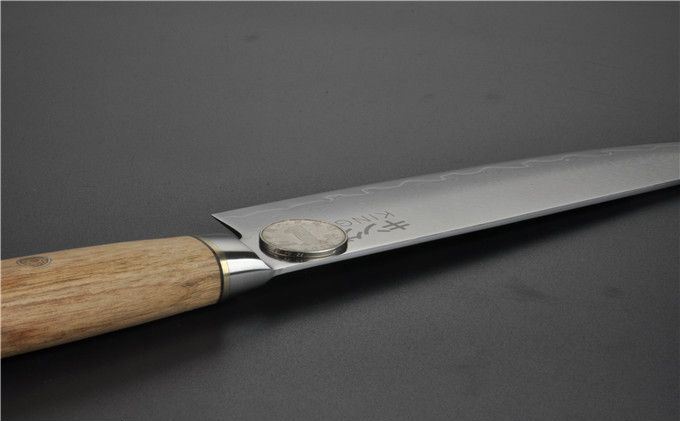 日本进口厨刀大马士革钢VG10白蜡木8寸 全长:32.5cm 刃长:20.2cm 手柄长:11.6cm 刃钢材:大马士革钢 硬度:60HRC 刃厚度:2mm 手柄材料:进口木蜡木+不锈钢头+手工刀纯铜马赛克铆钉 包装:高级AV礼品盒 锋芒之刃,刀刃采用进口VG10大马士革钢(祥云纹),经二次开刃,才能达到如此锋利、凌空削纸、超薄切片西红柿