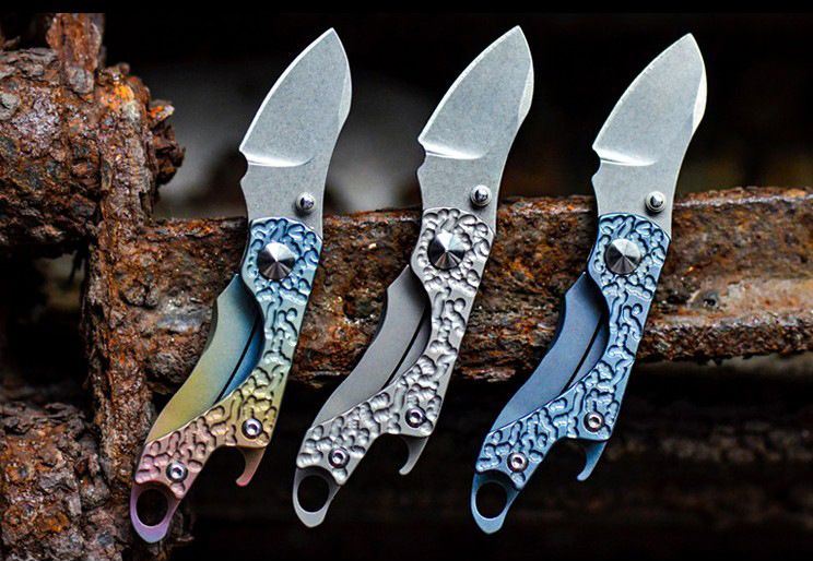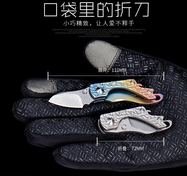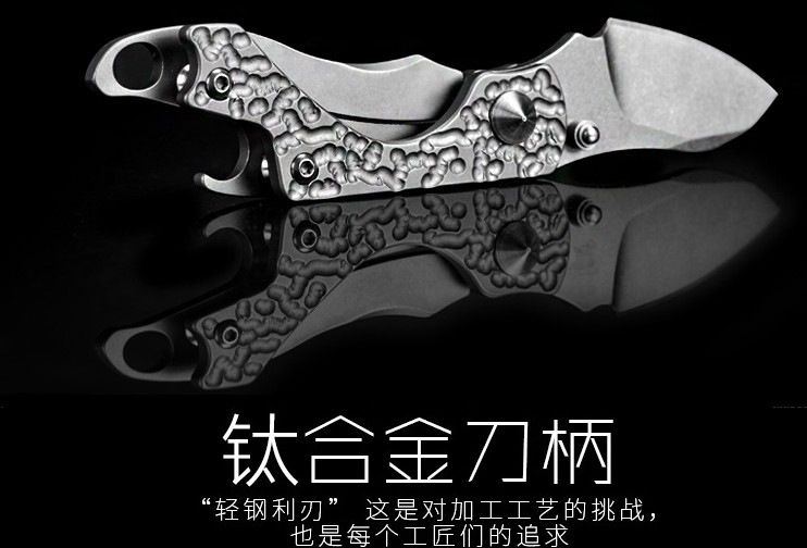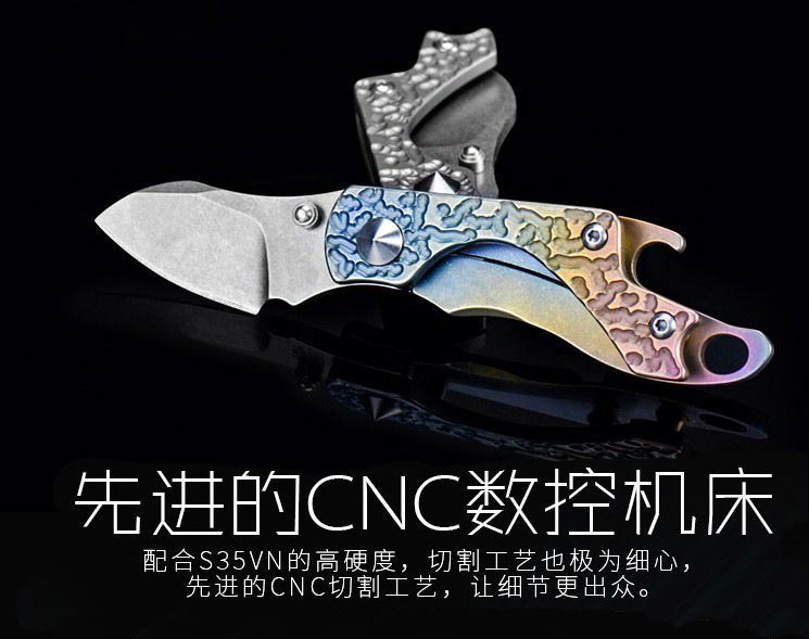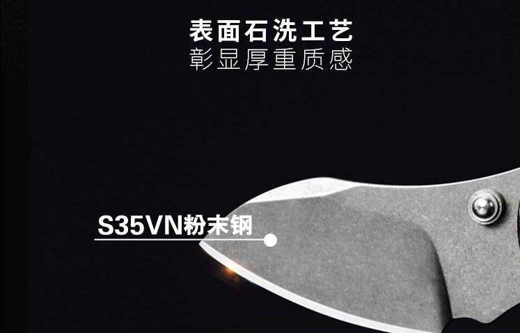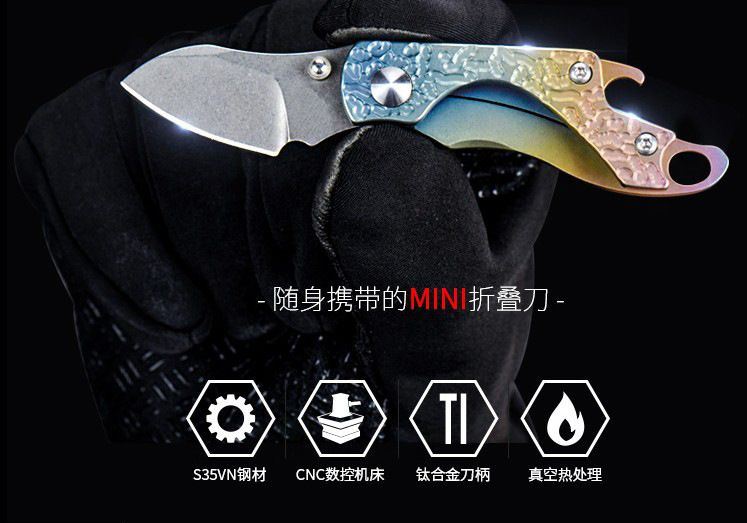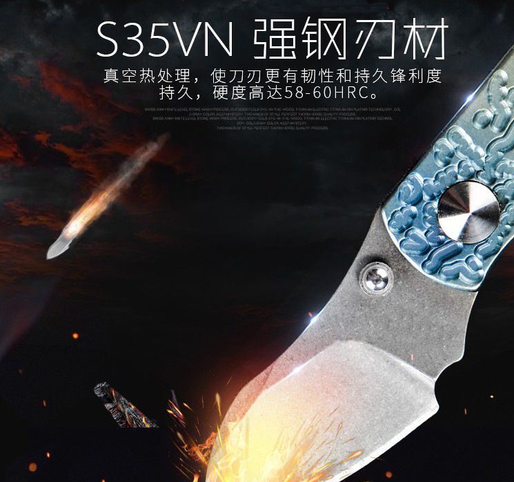 S35VN羊蹄钛柄折刀 全长:110MM 刃长:33MM 刃厚:3MM 刃宽:18MM 刃材:S35VN粉末钢 柄材:TC4钛合金 净重:34g 硬度:58-60HRC 包装:礼品盒