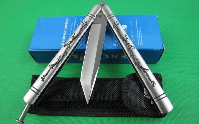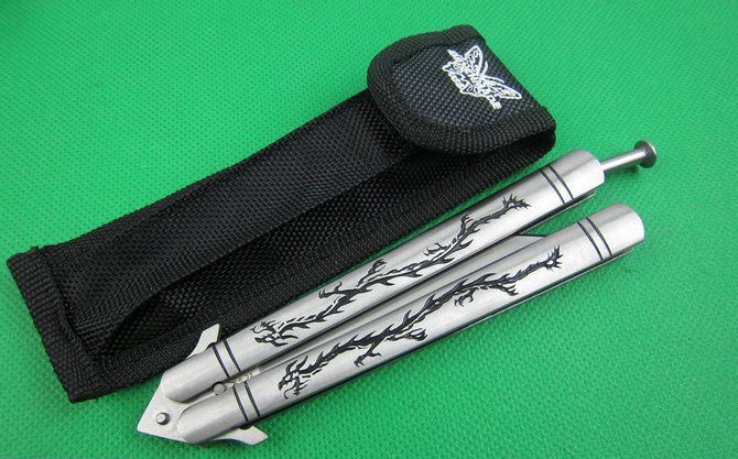 蝴蝶.C56S龙纹柄甩刀 全 长:24.0cm 刃 长:9.2cm 柄 长:13.5cm 刃 宽:1.9cm(最宽处) 刃 厚:2.8mm 刃 材:440C 硬 度:56HRC 刀 柄:钢柄,雕刻龙纹。 表 面:砂光 重 量:210.0克 配尼龙袋,原厂包装