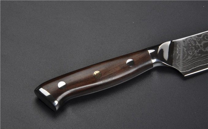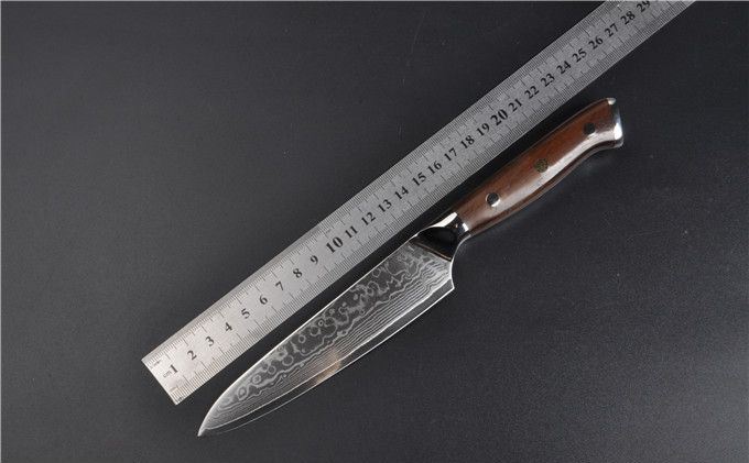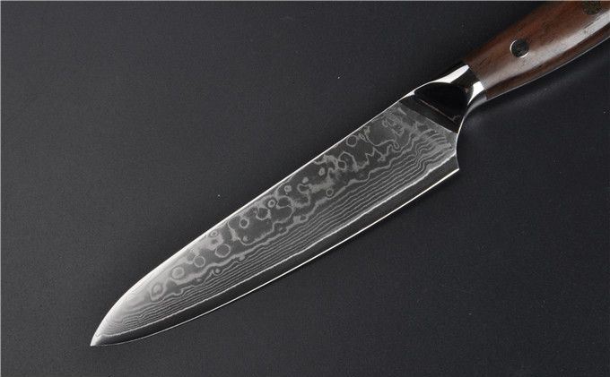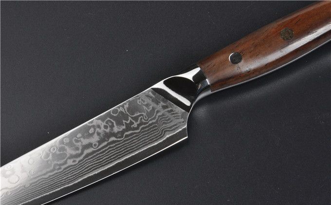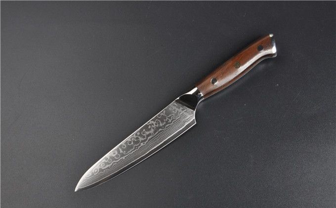 大马士革钢VG10黄檀柄5寸水果刀 全长:24.5cm 刃长:13 刃钢材:大马士革钢 硬度:60HRC 刃厚度:2mm 手柄材料:黄檀木+不锈钢头+手工刀纯铜马赛克铆钉 包装:高级AV礼品盒 本刀采用进口VG-10大马士革钢锻造制作,具有硬度高,防锈性能好,韧性好的特点。以达到优异的锋利度和切削效果。刀柄采用天然黄檀木配铜花钉,手感更加舒适美观!配送礼品盒,居家送礼之精品!具有很高的使用和收藏价值!