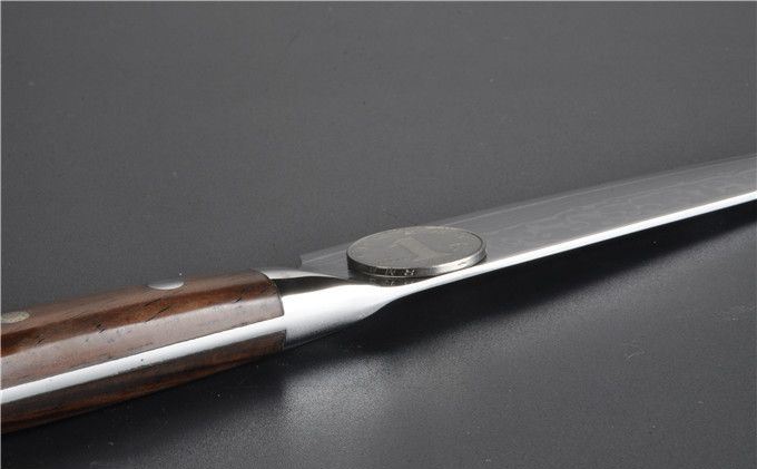 本刀采用进口VG-10大马士革钢锻造制作,具有硬度高,防锈性能好,韧性好的特点。以达到优异的锋利度和切削效果。刀柄采用天然黄檀木配铜花钉,手感更加舒适美观!配送礼品盒,居家送礼之精品!具有很高的使用和收藏价值!