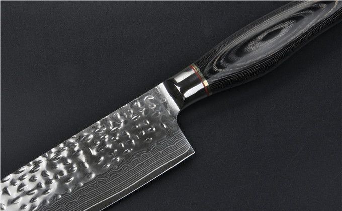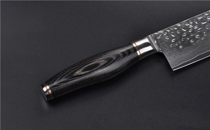 大马士革钢VG10-8寸锤纹浪花纹厨刀 全长:33.5cm 刃长:20cm 刃钢材:大马士革钢 硬度:60HRC 刃厚度:2mm 手柄材料:进口彩木+不锈钢头 包装:高级AV礼品盒 本刀采用进口VG-10大马士革钢锻造制作,具有硬度高,防锈性能好,韧性好的特点。以达到优异的锋利度和切削效果。刀柄采用天然彩,手感更加舒适美观!配送礼品盒,居家送礼之精品!具有很高的使用和收藏价值!