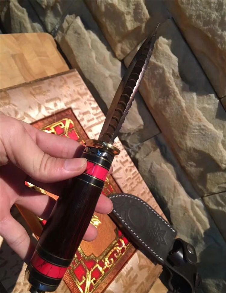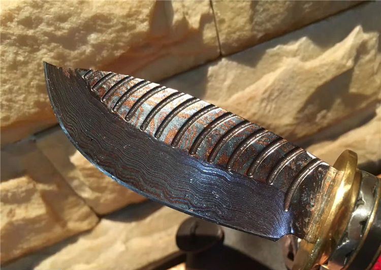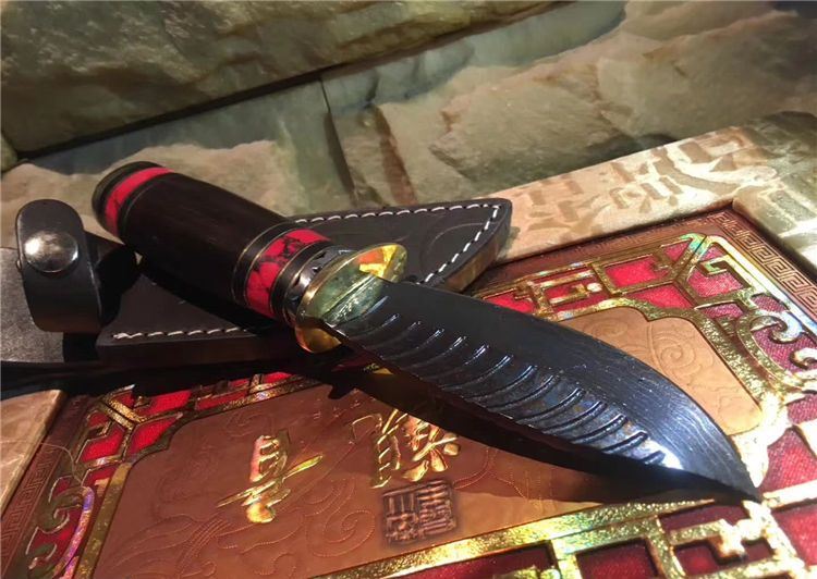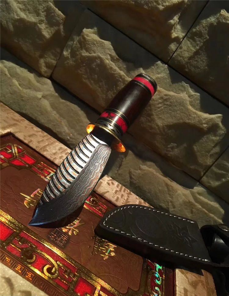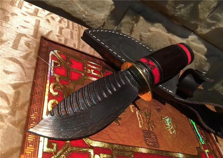 彩枫叶大马士革花纹猎刀 全 长:22.2cm 刃 长:11cm 刃 宽:3 cm(最宽处) 刃 厚:4.4mm 柄 长:11.2cm 表 面:锻打大马士革花纹 刃 材:大马士革钢 硬 度:59HRC 柄 材:檀木 重 量:400克(含包装) 包 装:皮套、纸盒。 其 他:刃口锋利 钢花纹和把手木纹及颜色各异,以实物为准