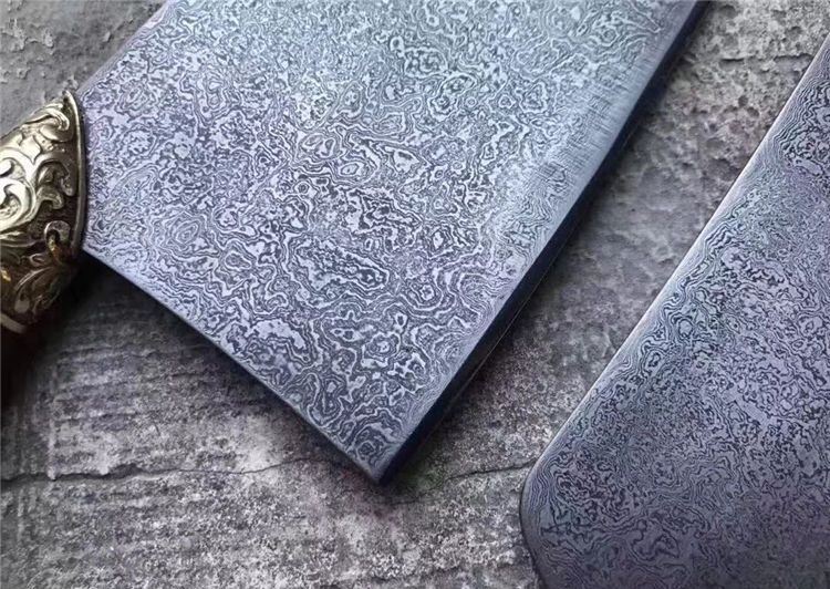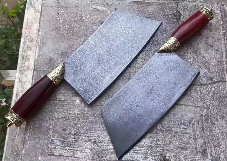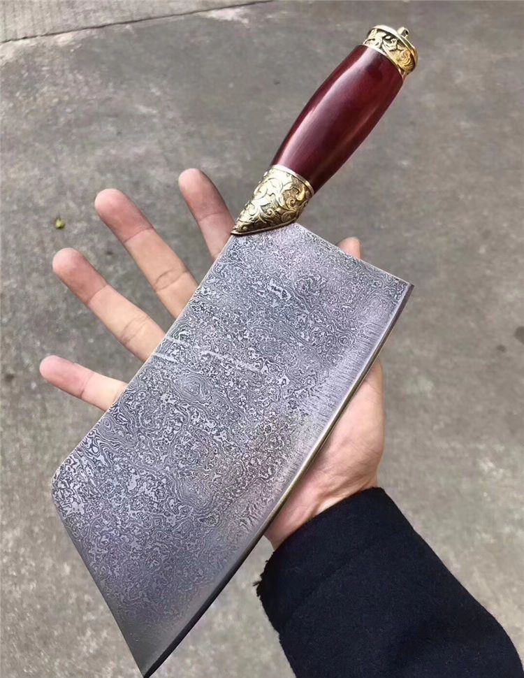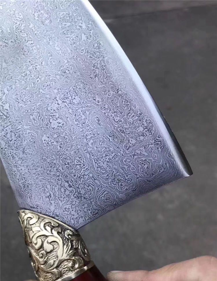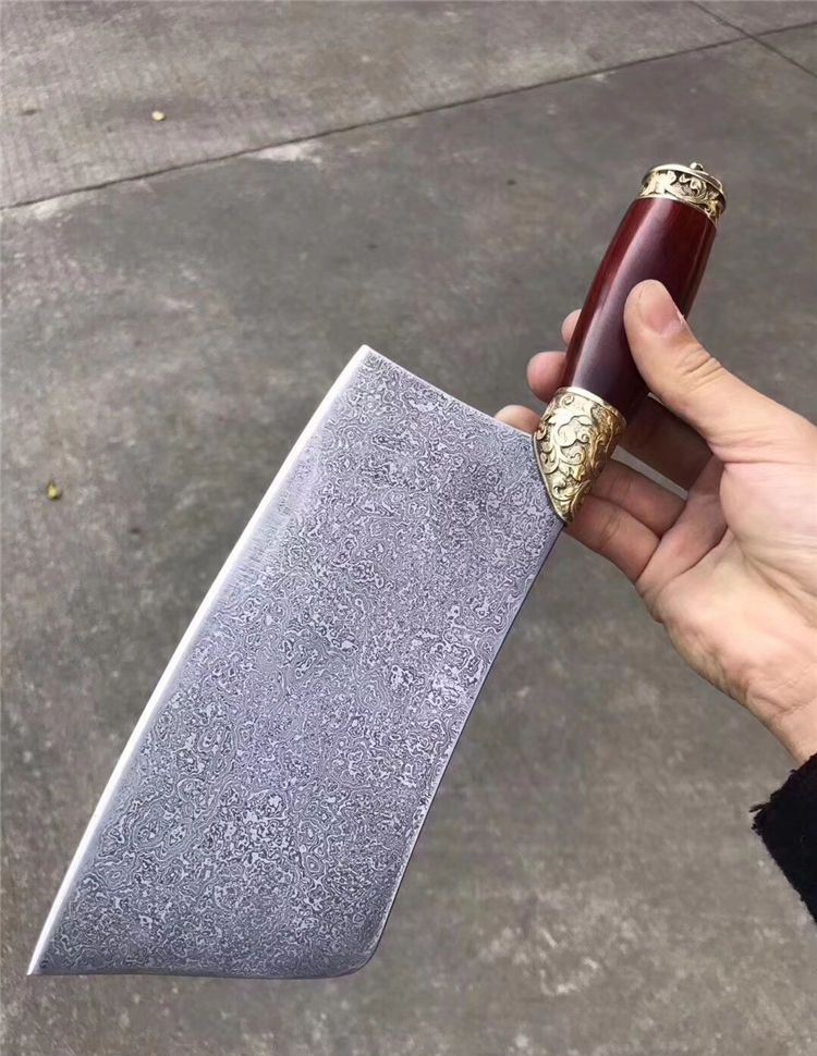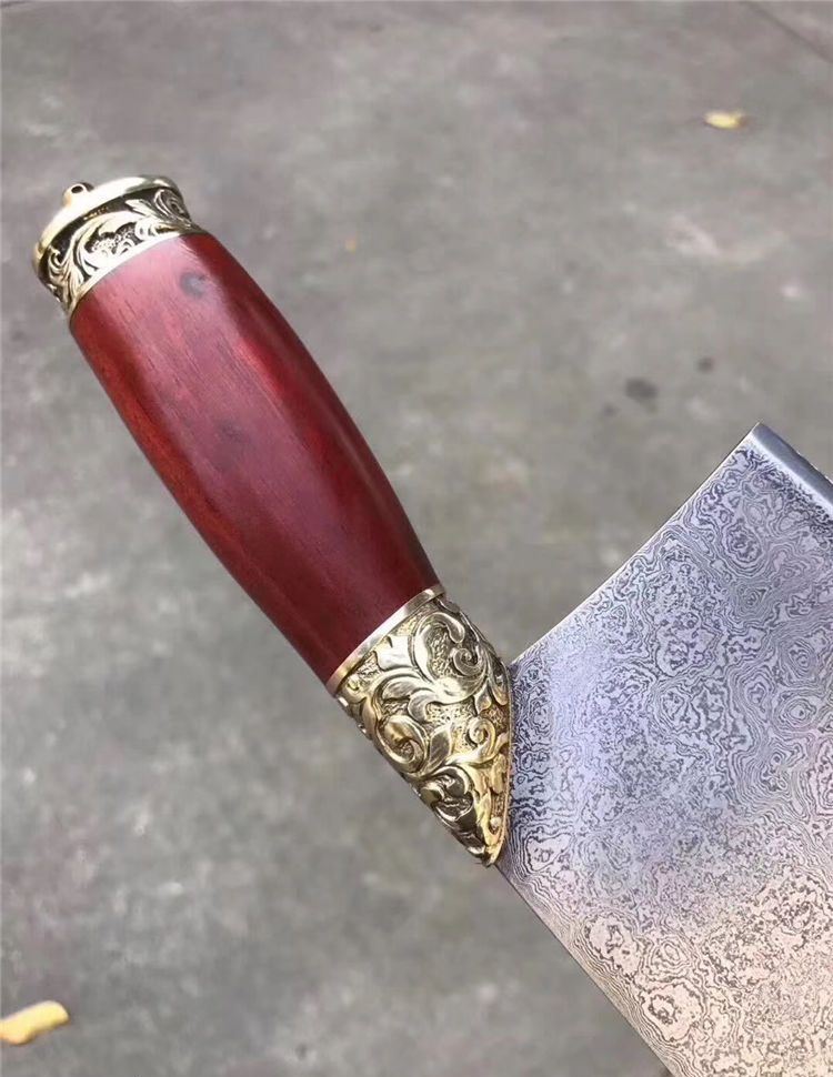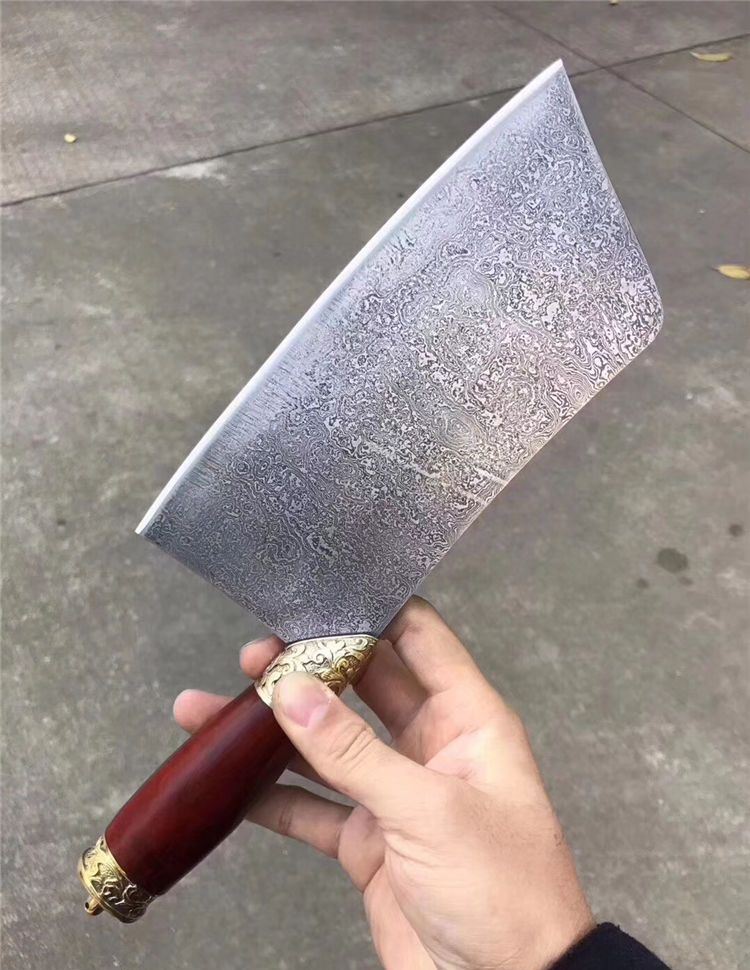 手工版定制红千层锻打花纹钢大菜刀 总长:33cm 刃长:21cm 刃厚:3-3.5MM之间 刃宽:9.6cm 钢材:锻打千层花纹钢(大马士革) 硬度:60-61HRC 热处理:传统工艺油淬 柄材:皇帝木(科檀木) 档手:纯铜雕花!锋利度超好,与韧性保持度好!