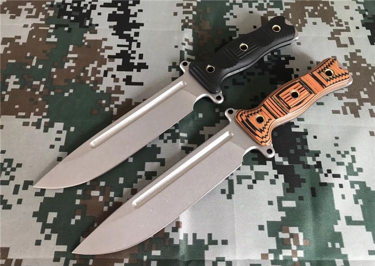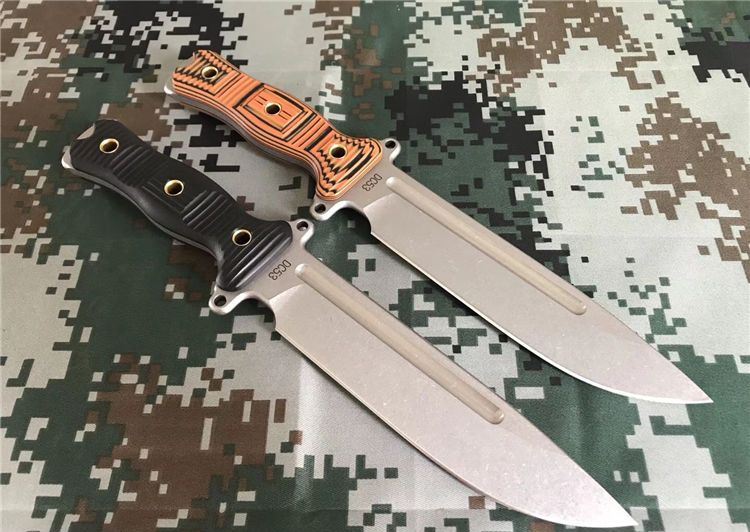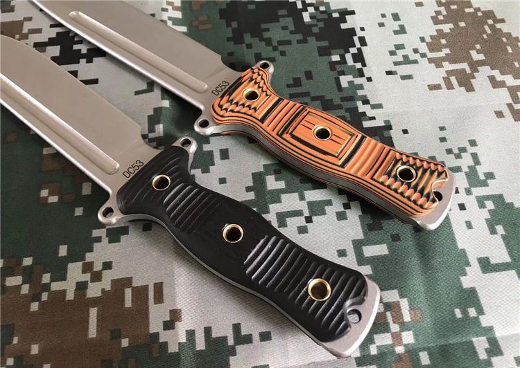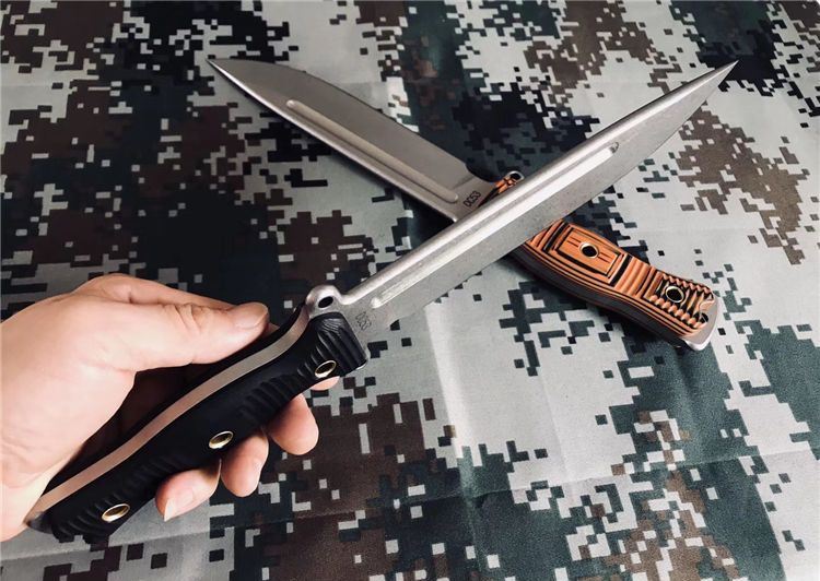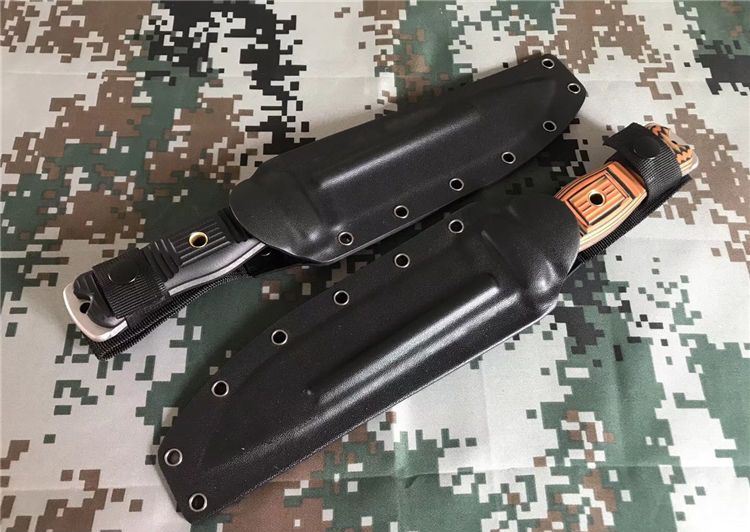 大号野牛轻骑兵直刀 全长:333mm 柄长:138mm 刃长:195mm 刃厚:6.0mm 刃宽:42mm(最宽处) 刃材:DC53 重量:500g(刀净重,不含鞘) 硬度:59-60HRC 柄材:橙黑夹层G10 刀鞘:美国进口Kydex 磨式:数控V磨 表面处理:精细石洗 热处理:真空油淬(增加晶体颗粒细腻度,具有最好的韧性) 包装:黑色礼品盒