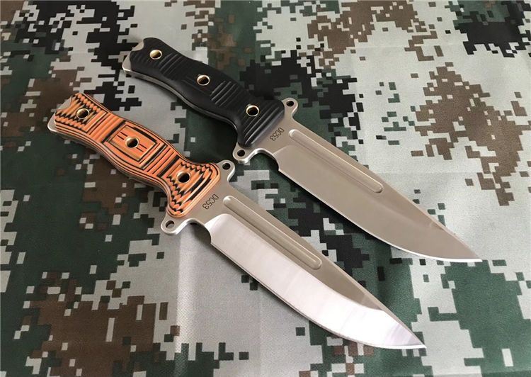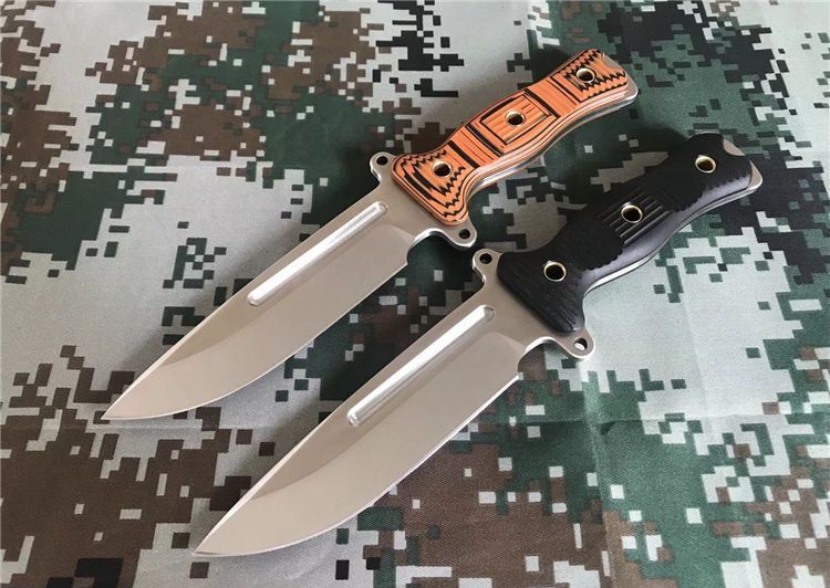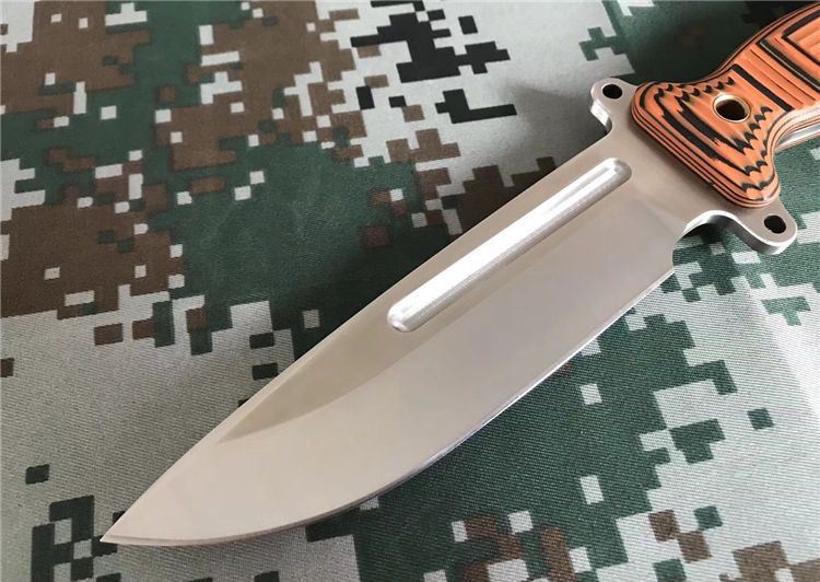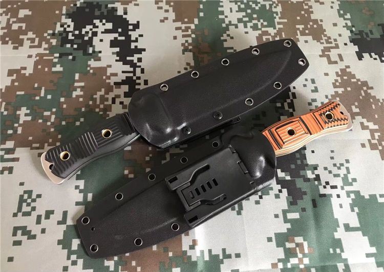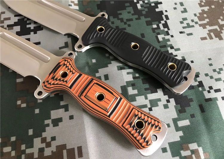 小号野牛轻骑兵战术直刀 全长:298mm 柄长:138mm 刃长:165mm 刃厚:5.8mm 刃宽:40mm(最宽处) 刃材:DC53 重量:420g(刀净重,不含鞘) 硬度:59-60HRC 柄材:橙黑夹层G10 刀鞘:美国进口Kydex 磨式:数控V磨 表面处理:精细沙光 热处理:真空油淬(增加晶体颗粒细腻度,具有最好的韧性) 包装:黑色礼品盒
