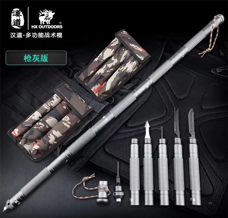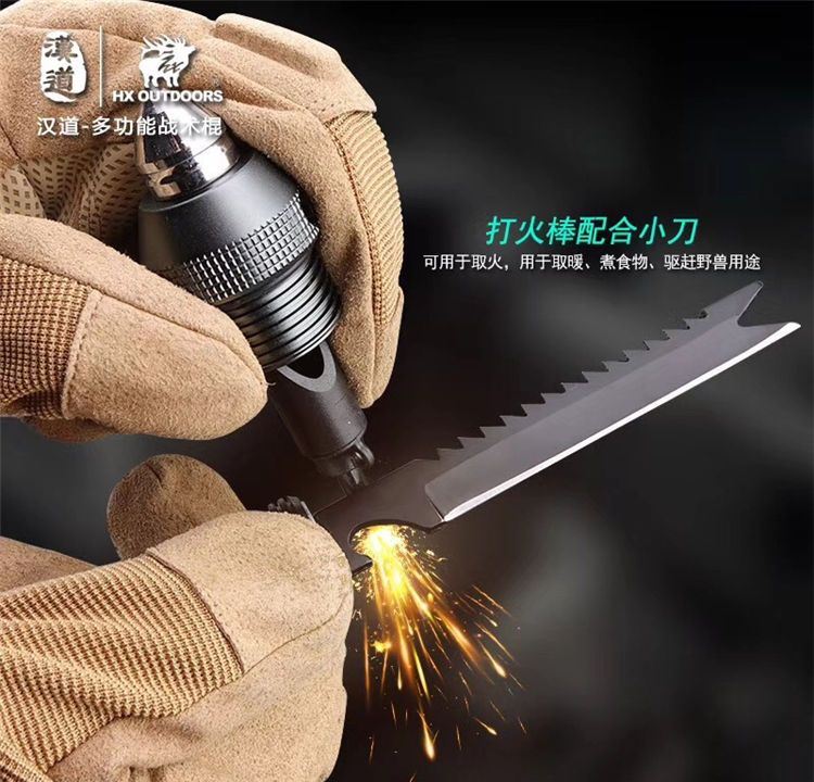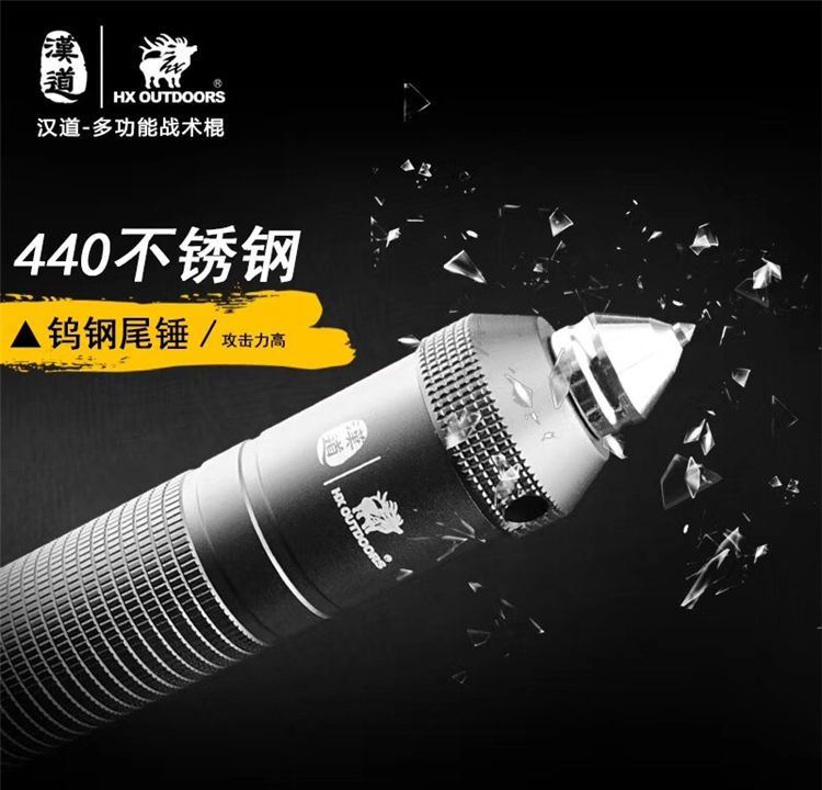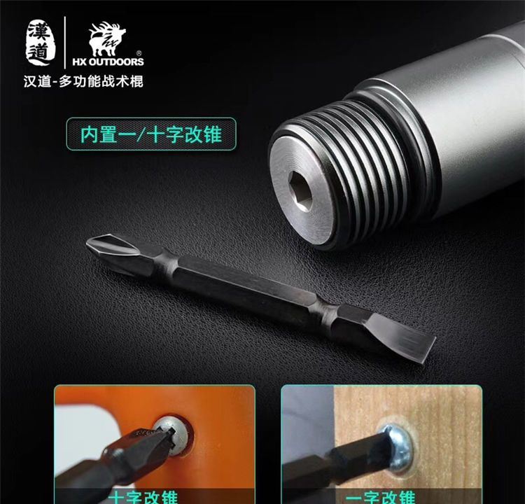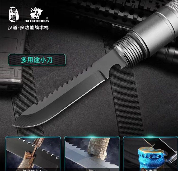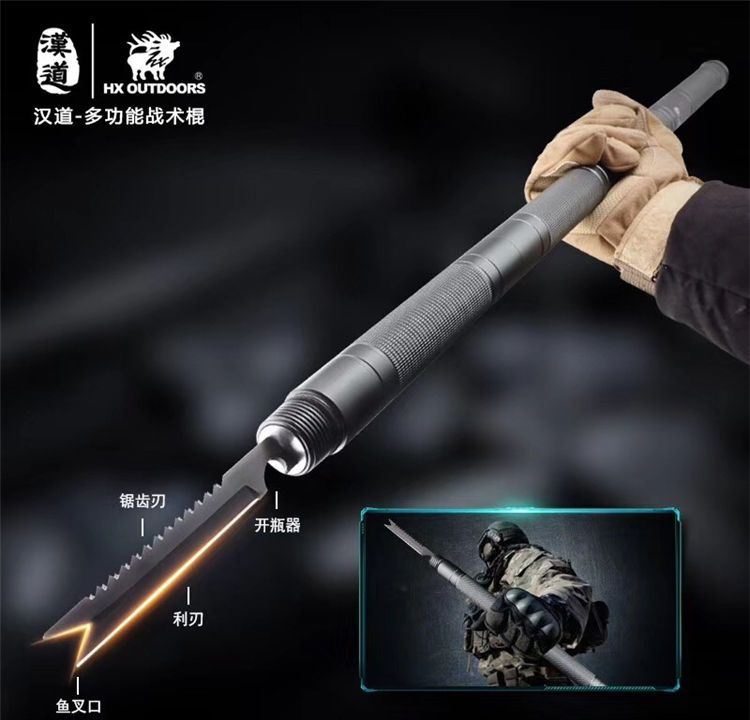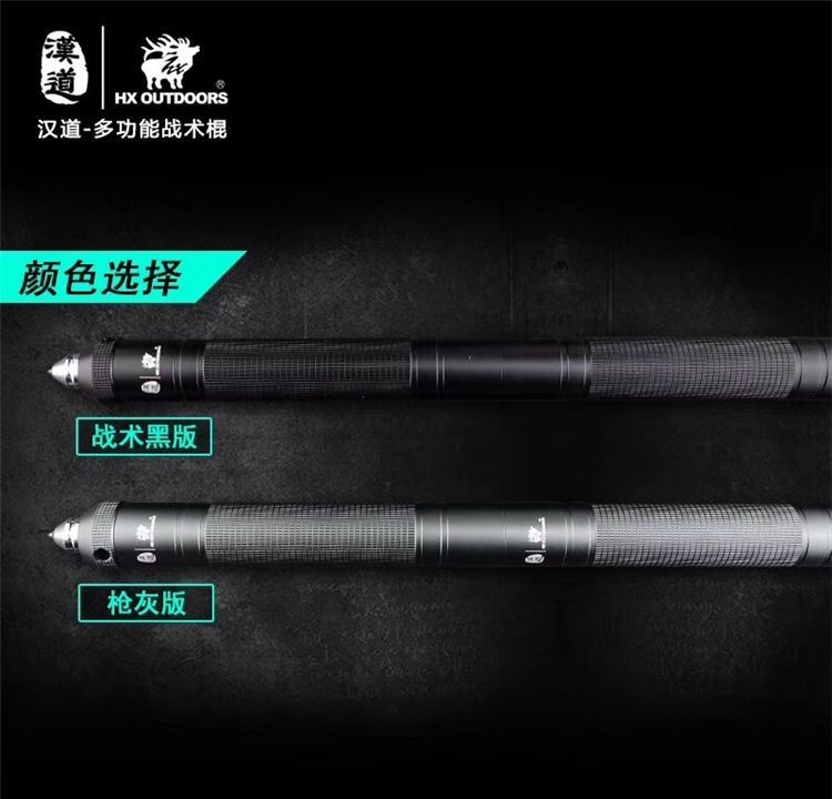 汉道多功能战术棍 采用440不锈钢打造,多节设计可加长缩短; 柄尾钨钢尾锥,内置多种功能组件,利刃、锯齿、开瓶器、打火棒/求生口哨、一/十字改锥、指南针、冰锥,一应俱全;枪灰版战术黑版两种版本可选。