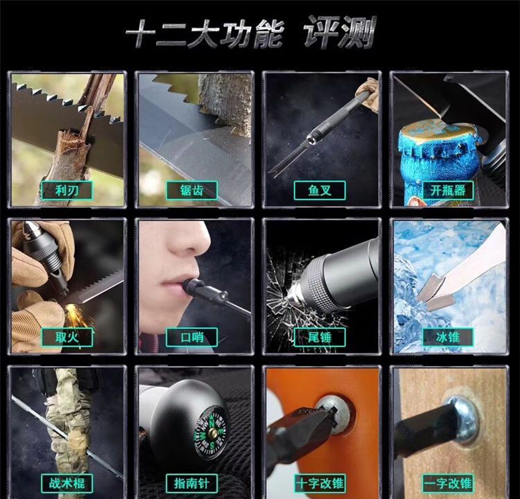 柄尾钨钢尾锥,内置多种功能组件,利刃、锯齿、开瓶器、打火棒/求生口哨、一/十字改锥、指南针、冰锥,一应俱全;枪灰版战术黑版两种版本可选。