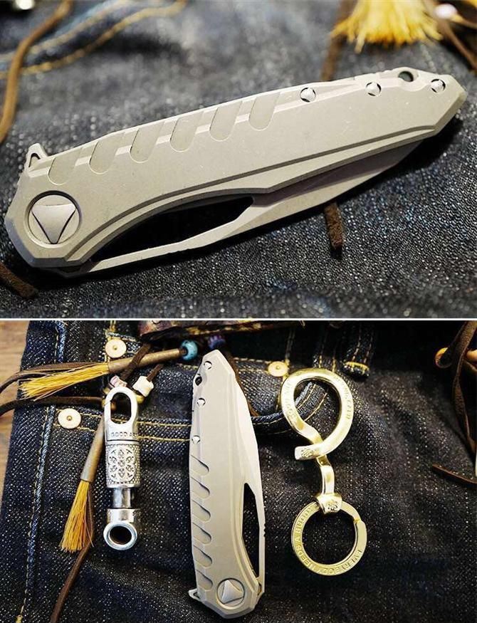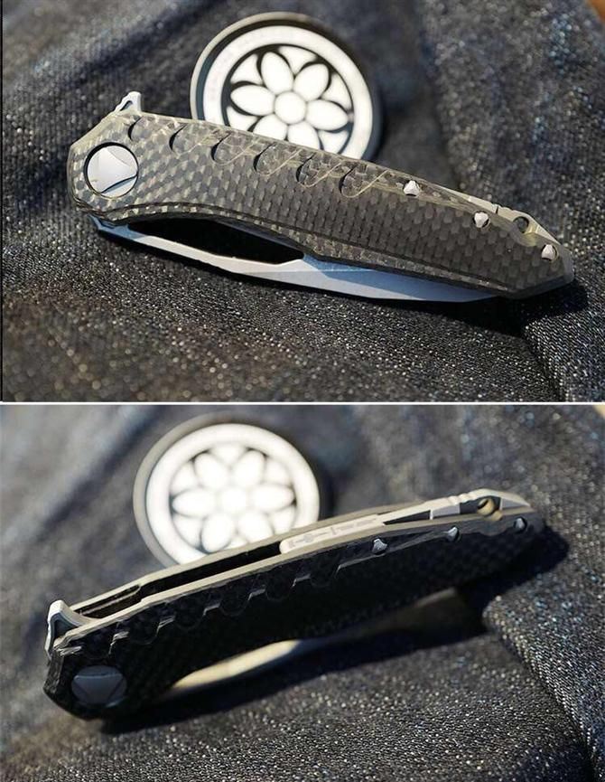 绿刺版微技术魔符折刀 全长:203mm 闭合长度:103mm 刃长:85mm 刃宽:28mm 厚度:3.9mm 柄材:高档钛合金、碳纤维 表面:石洗 刃材:M390第三代粉末不锈钢 硬度:HRC61 附件:尼龙鞘