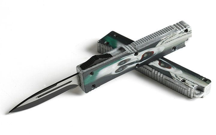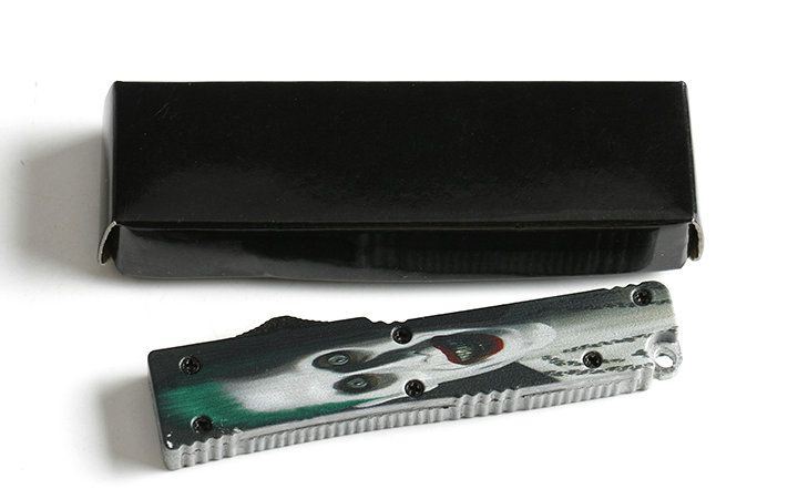 微技术明星迷你单锋直弹刀 全长:13.0cm 刃长:5.0cm 刃厚:1.9mm 刃材:440 硬度:57HRC 刀净重:52.0克 总重量:60.0克(含包装物) 表面:拉丝伴黑色(刀刃) 柄材:锌铝合金 刀鞘:无 锁闭:弹簧直出