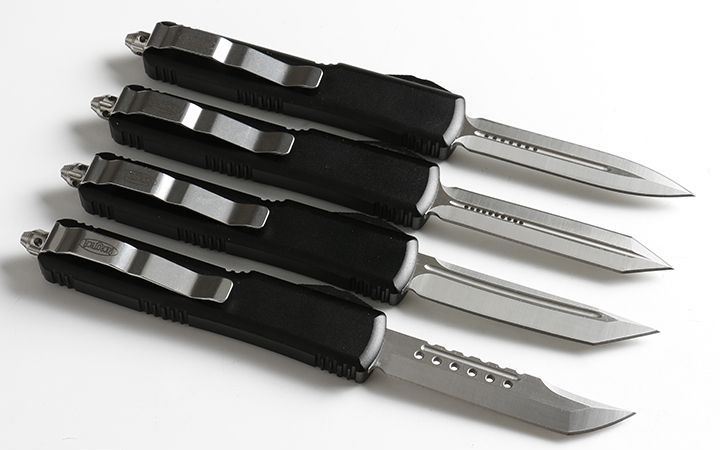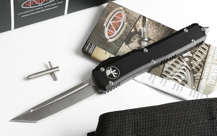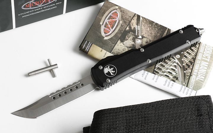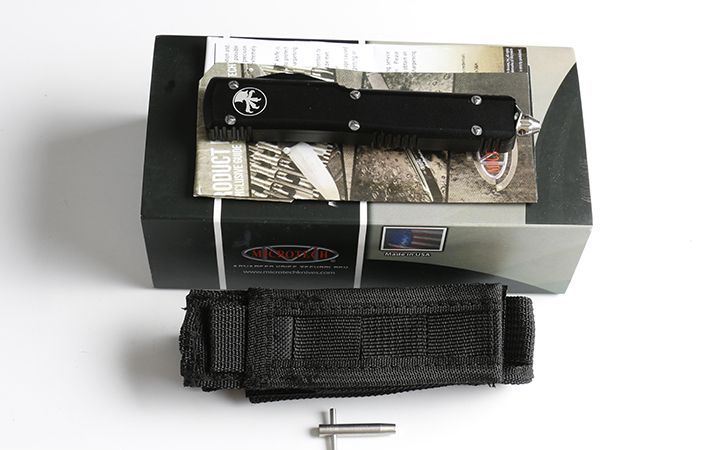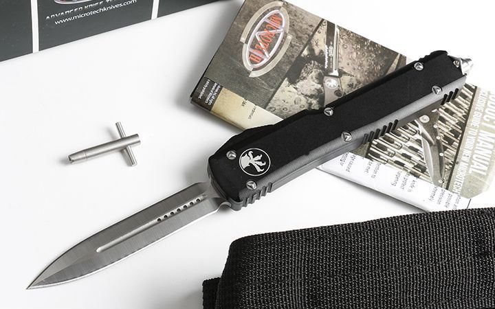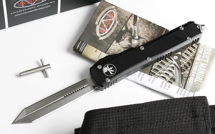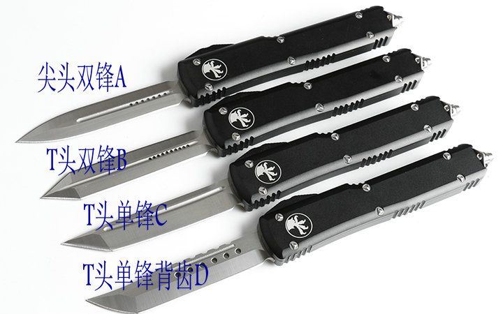微技术UT大号直出跳刀(四款式圆角柄) 全长:21.5 CM 刃长:8.5CM 柄长:12.5CM 刃宽:1.6CM 刃厚:0.31 CM 刀刃材质:7CR17 柄材:铝合金镀黑钛 刀型:直跳,分ABCD四款式,下单请注明。 锁定类型:按钮锁 重量:215克(含包装) 附件:尼龙套,说明书,彩盒,送拆刀工具 整刀用CNC,电脑锣,线切割制作而成,手工,精密度非常高