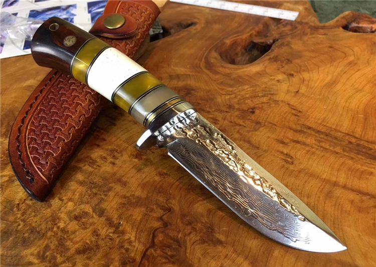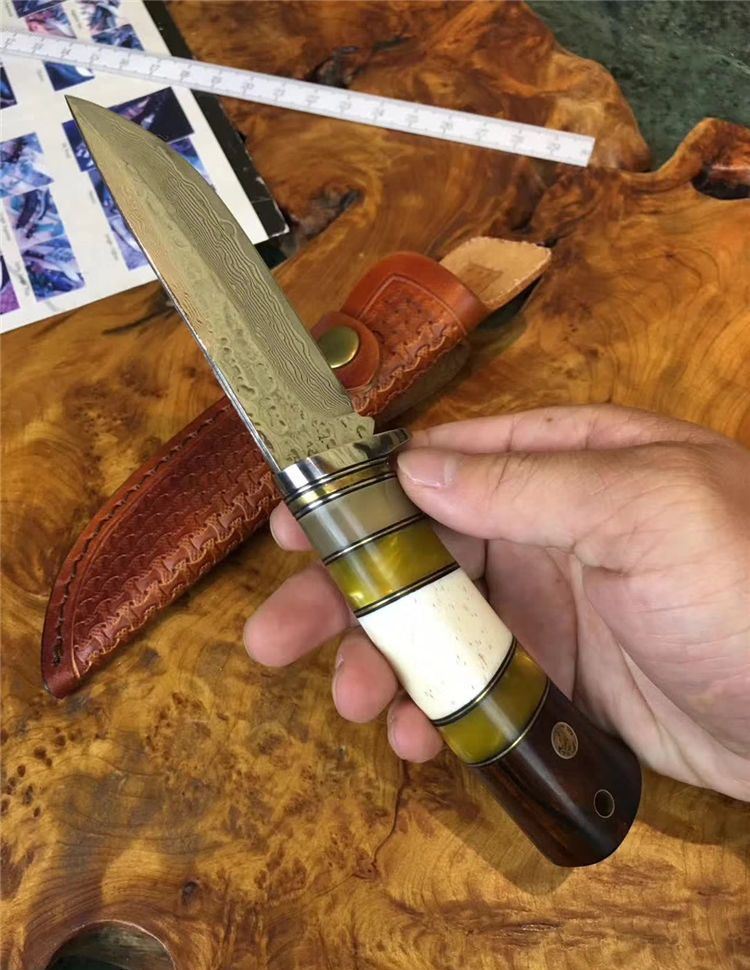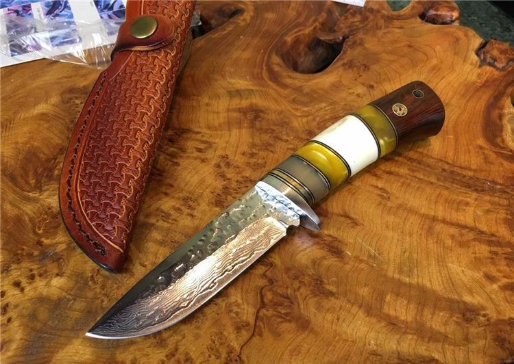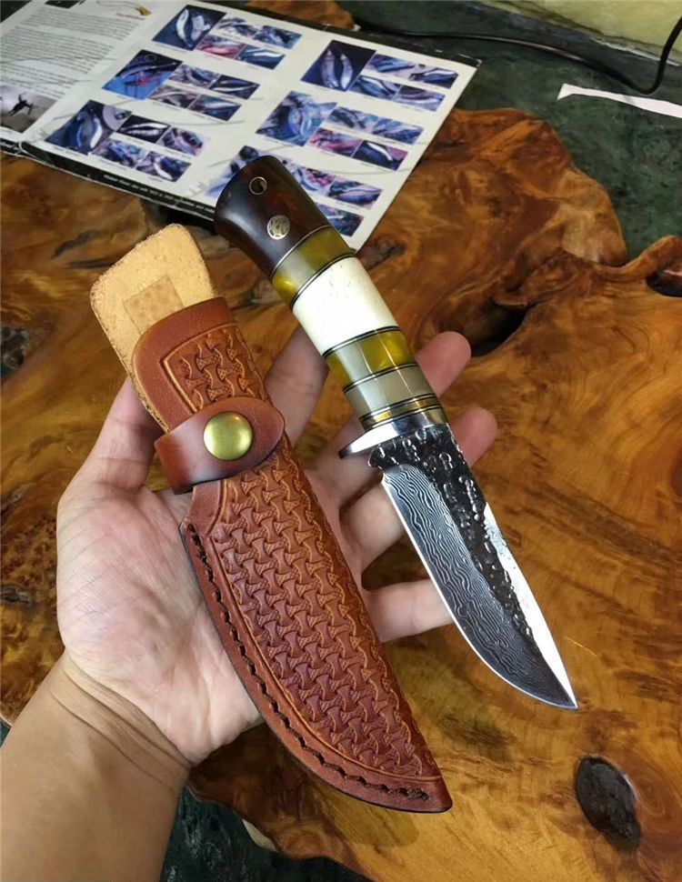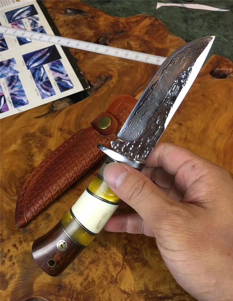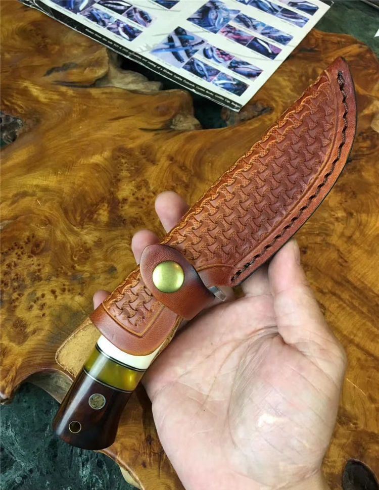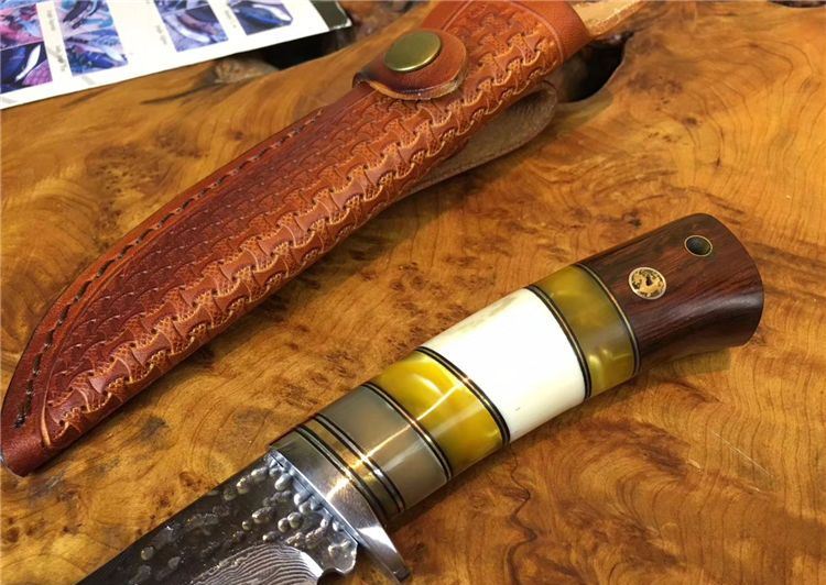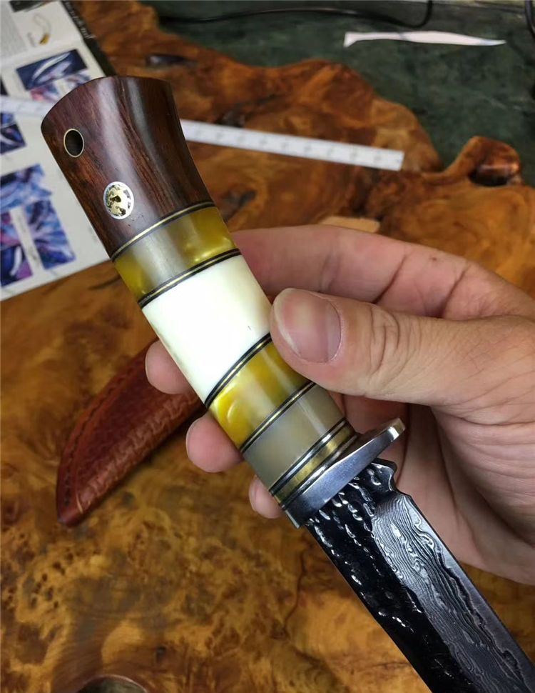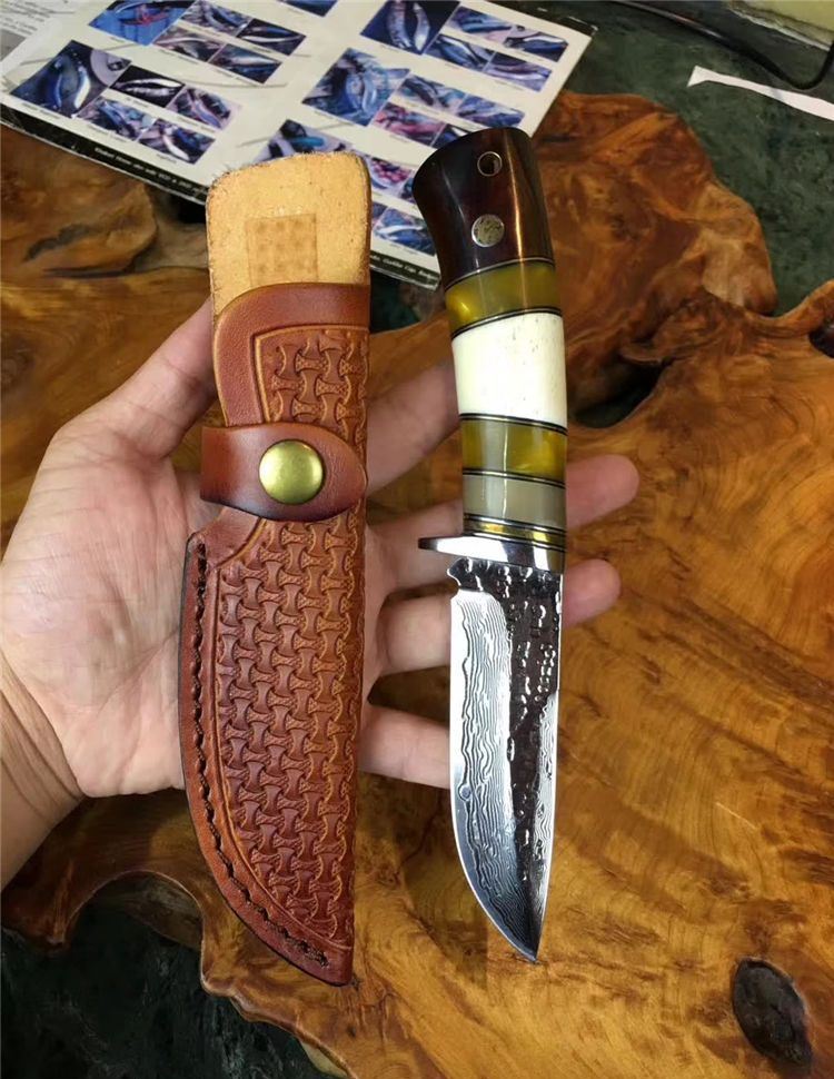 小龙女大马士革直刀 全长:22cm 刃长:9.9cm 硬度:59 钢材:大马士革钢配手工皮套 树脂、驼骨黄檀木组合手柄