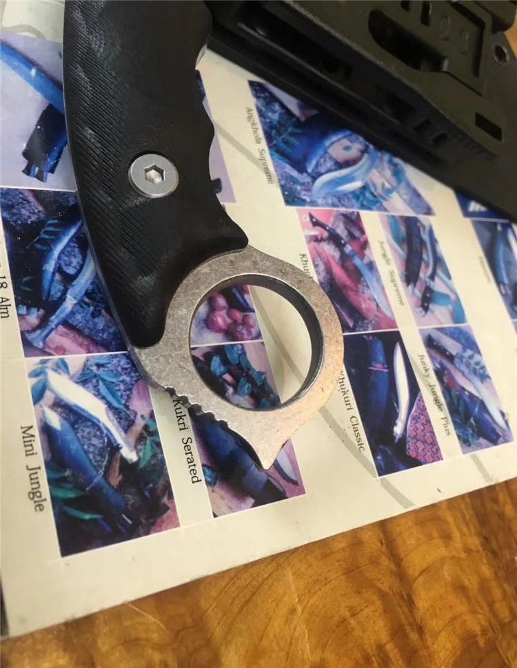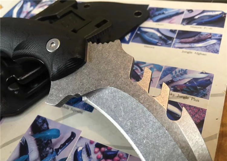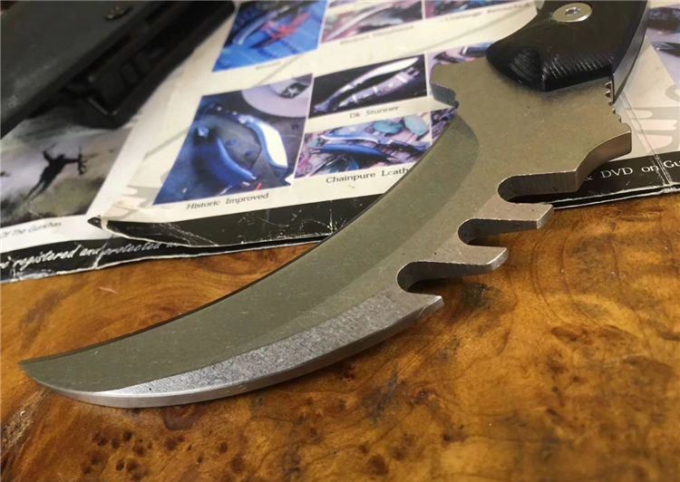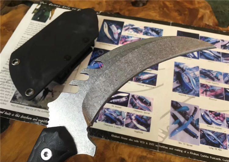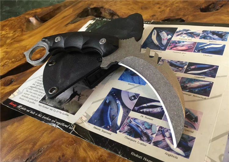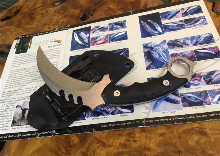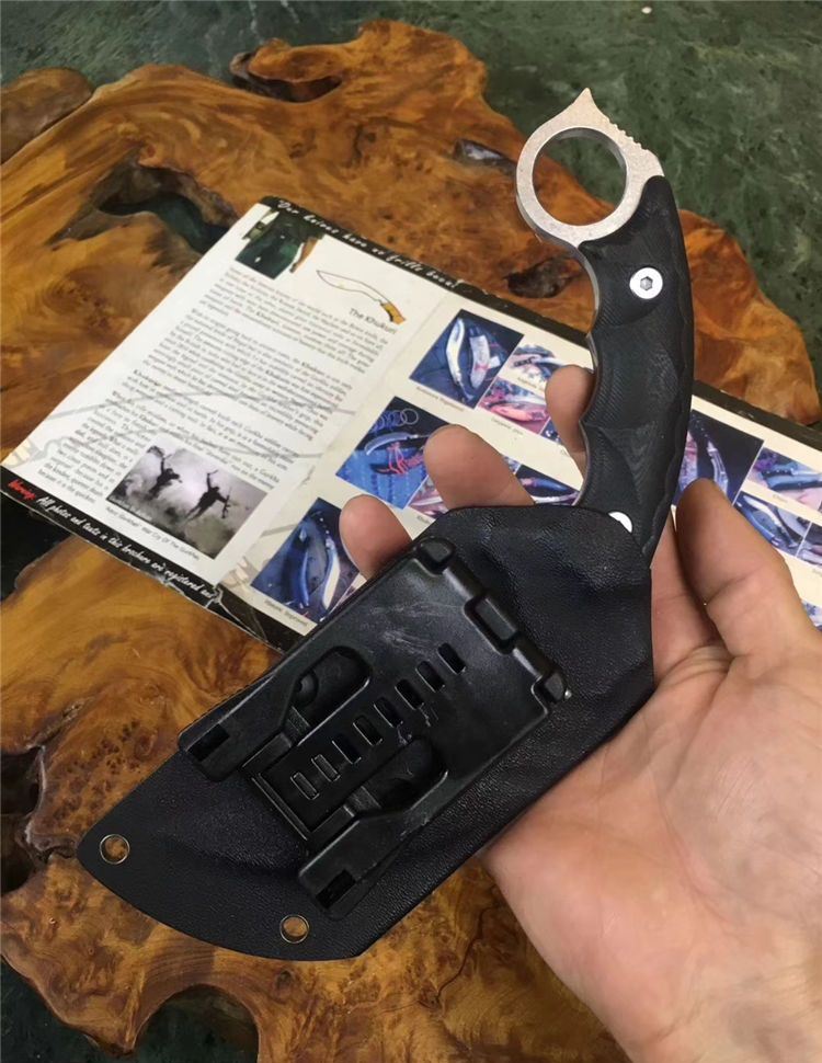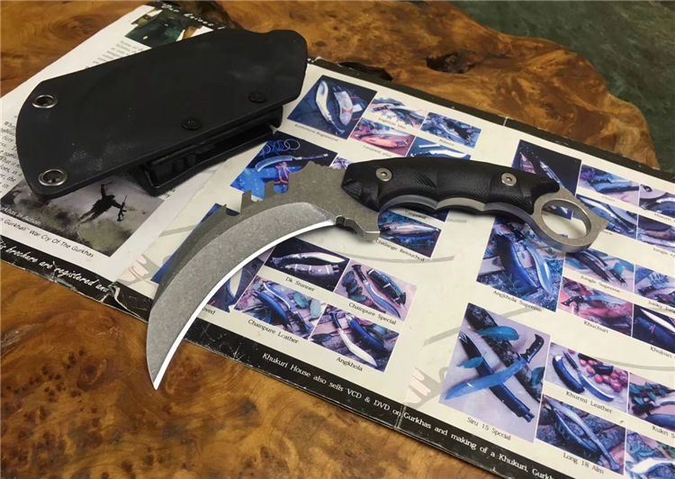刃牙爪刀石洗版本 全长:210mm 刃长:100mm 刃厚:5.0mm 刃宽:35mm 材料:440c不锈钢 硬度:58 手柄黑色g10 cnc手柄 配K鞘背夹