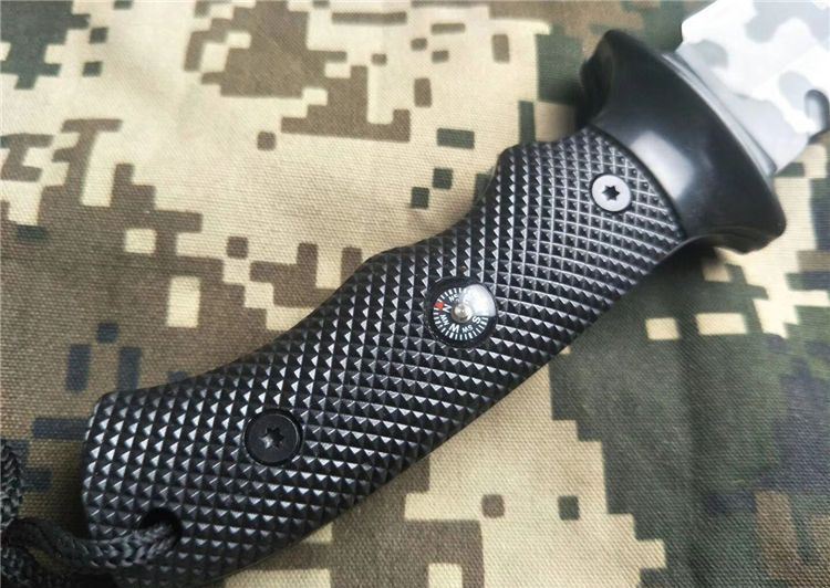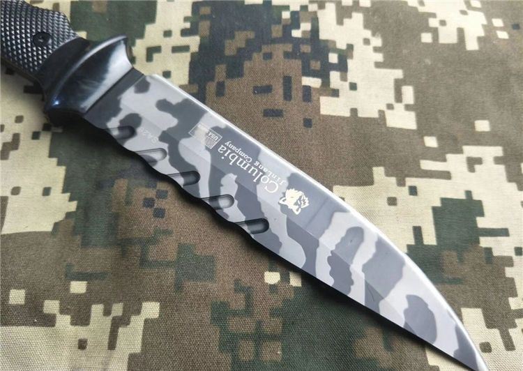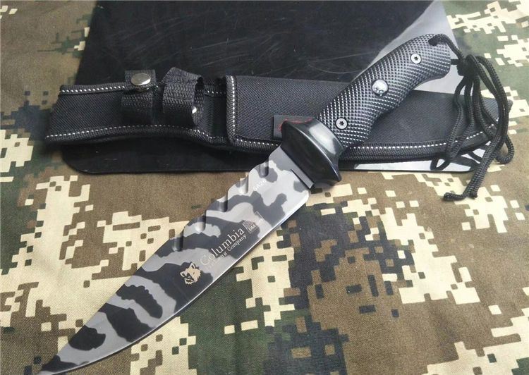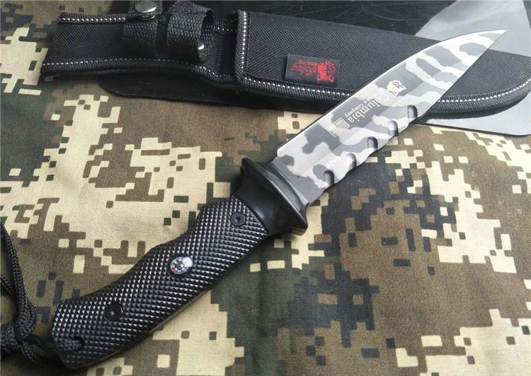 哥伦比亚狼头战术直刀 全长: 31cm 刃长: 17cm 刃宽: 3.5cm(最宽处) 刃材: 420 硬度: 55 表面: 黑漆刃 厚: 0.4cm 柄长: 12.5cm 柄厚: 2.5cm 柄材: 橡塑(手感很好) 重量: 300克 其他: 已开锋