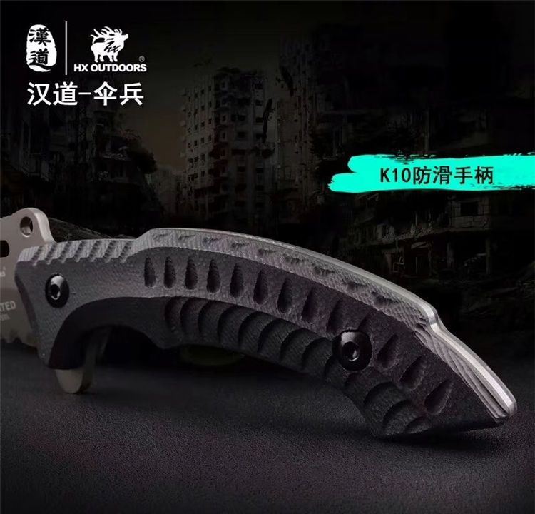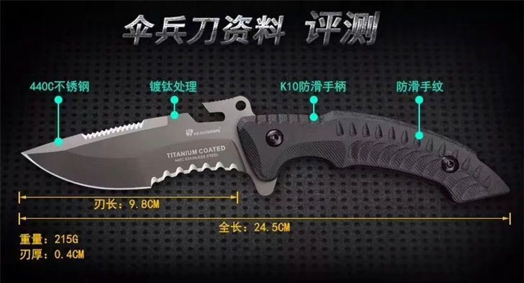 采用440c不锈钢打造,表面镀钛处理,设计齿刃与利刃以应对多种切割需求;采用K10复合纤维手柄,表面设计防滑手纹,握感舒适稳固;配备专用护刃K鞘,携带安全可靠