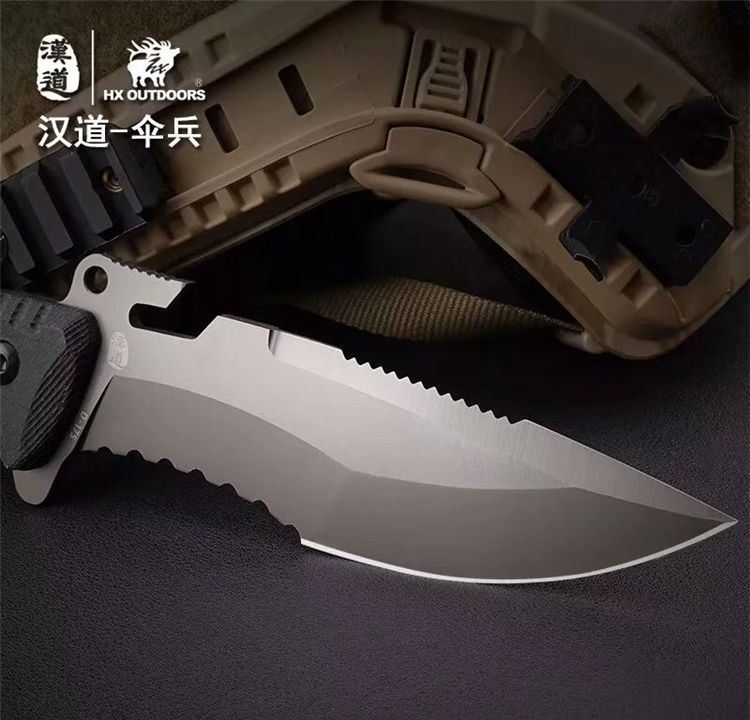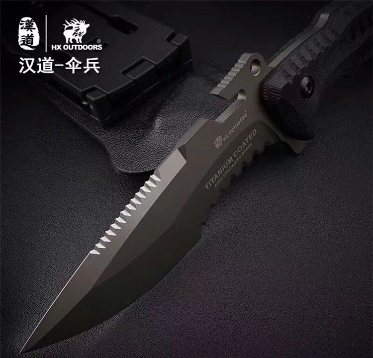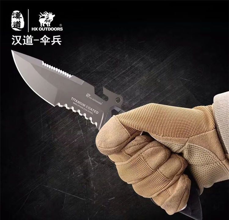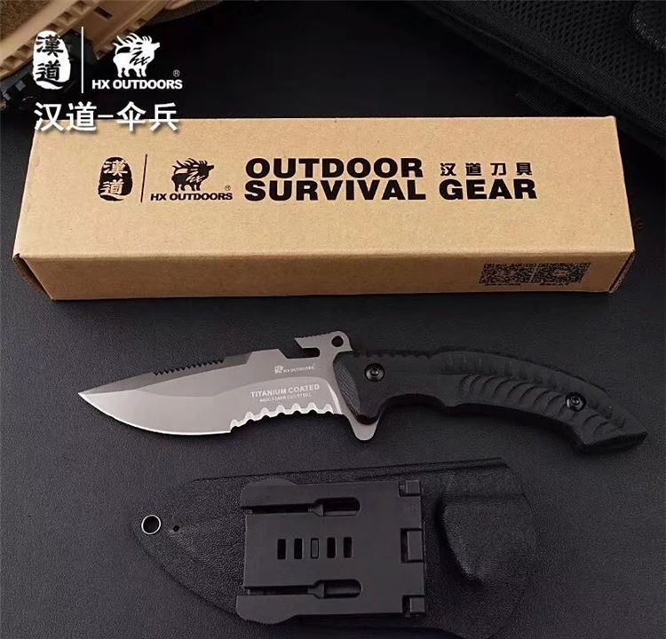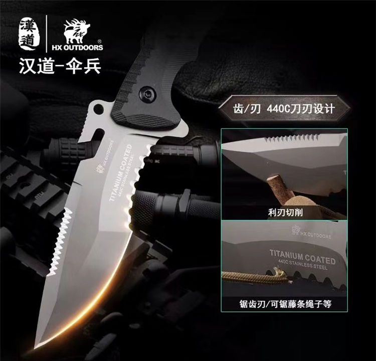 汉道伞兵战术直刀 全 长:245mm 刃 长:98mm 刃 厚:4mm 刃 材:440C不锈钢 柄 材:K10防滑手柄 硬 度:58HRC 表 面:镀钛 其 他:配战术K鞘 采用440c不锈钢打造,表面镀钛处理,设计齿刃与利刃以应对多种切割需求;采用K10复合纤维手柄,表面设计防滑手纹,握感舒适稳固;配备专用护刃K鞘,携带安全可靠