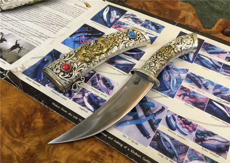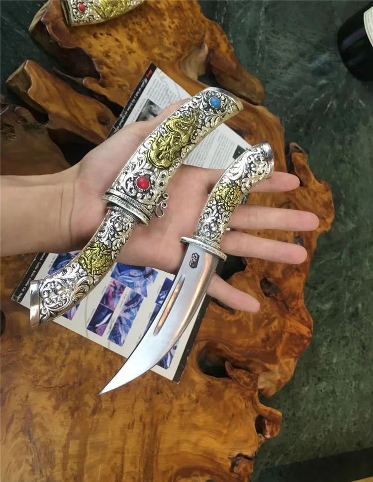 二珠小凤仙藏刀 全长:22cm 刃长:12cm 刃宽:3cm 柄长:10.5cm 刃厚:0.5cm 重量:200g 硬度:58-61HRC 柄材:纯黄铜,藏银 表面錾有藏族图腾图案 护手:白铜 刃材:弹簧钢锻打 (由于纯手工打造,表面可能会留有锻打黑斑,属于正常现象) 鞘材: 白铜纯手工制做,中间镶铜,内装木芯以保护刀刃。纯手工制做,中间镶铜,内装木芯以保护刀刃