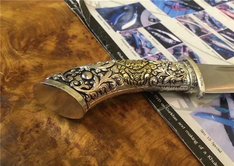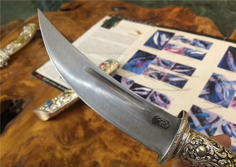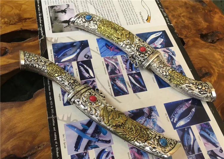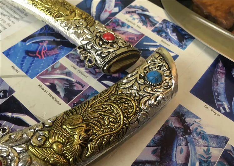 鞘材: 白铜纯手工制做,中间镶铜,内装木芯以保护刀刃。纯手工制做,中间镶铜,内装木芯以保护刀刃