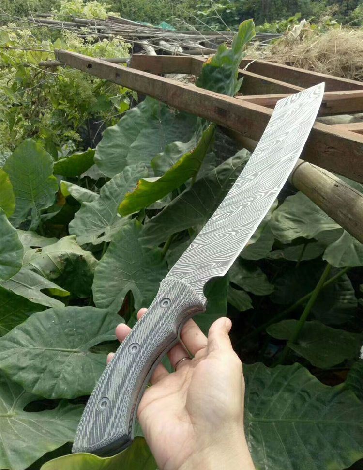新版索林根羽毛纹砍刀 全长:500mm 刃长:330mm 柄长:150mm 刃宽:55mm 刃厚:6mm 刃材:7Cr13Mov 重量:1000g(含包装) 硬度:60HRC 表面:腐蚀纹 柄材:米塔柄 锁型:定锁 其他:配彩盒和皮套