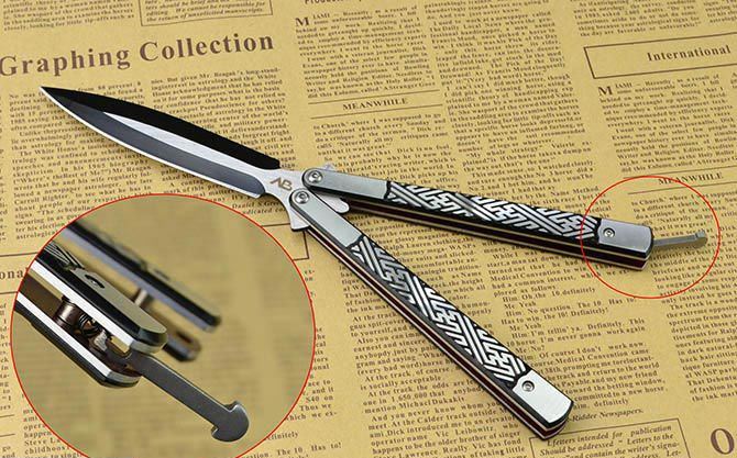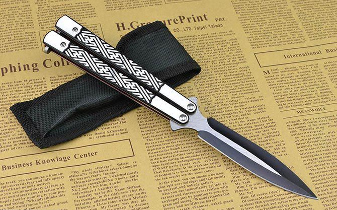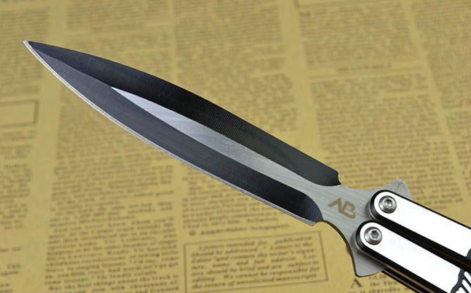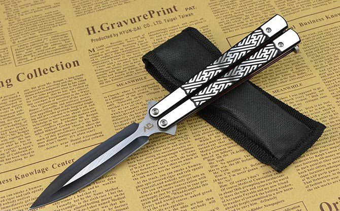 AB复古纹甩刀 全 长:22.7cm 刃 长:9.5cm 柄 长:12.2cm 刃 宽:2cm 刃 厚:2.2mm 刃 材:420 重 量:121g(含包装) 硬 度:52HRC 表 面:砂光+发黑 柄 材:合金 锁 型:甩刀 包 装:尼龙套