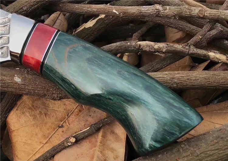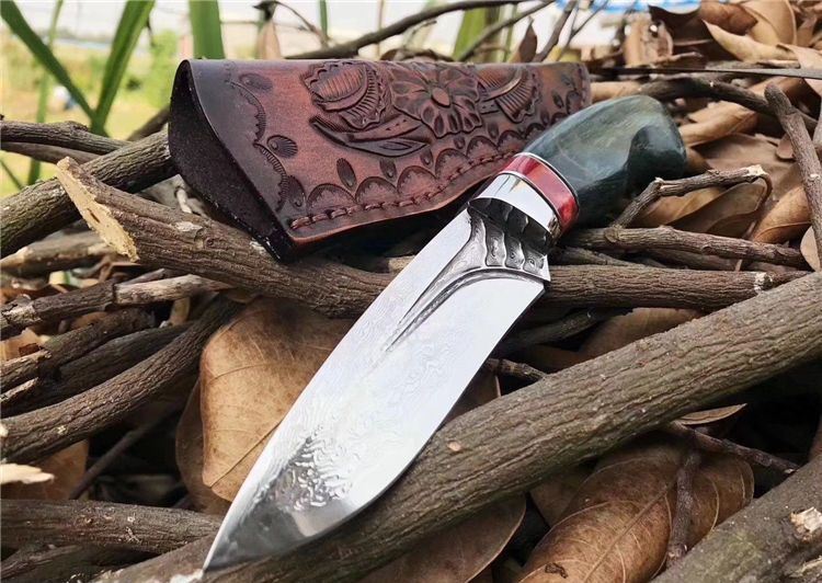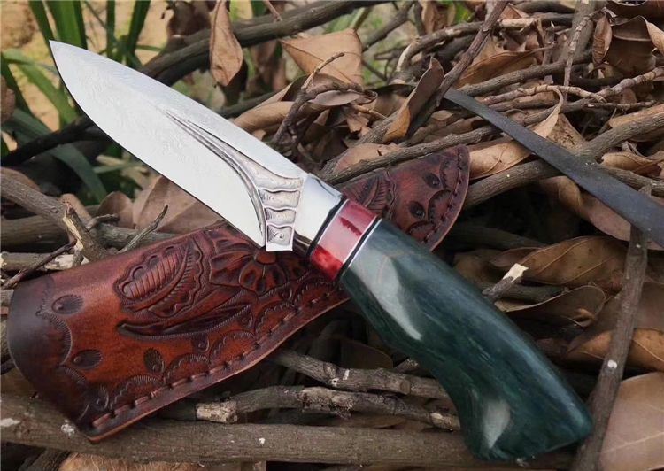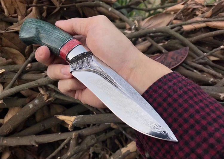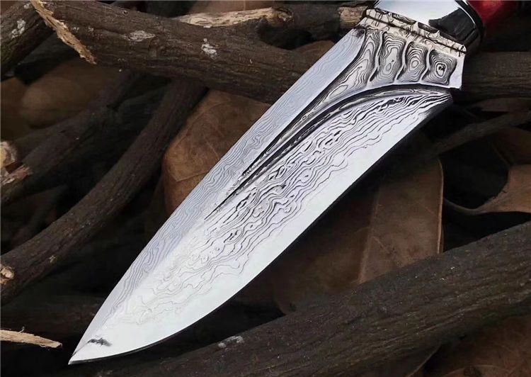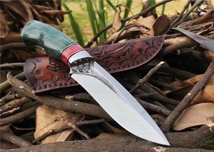 大马士革青霜猎刀 刃材:进口大马士革钢 柄材:钢头+固化彩木材料制作 总长:225MM 刃长:105MM 刃厚:2.8MM 刃宽:30MM 硬度:58HRC 热处理技术:真空热处理 护手:大马士革钢头 开刃方式:水冷二次开刃,以锋利度为主 皮套包装:复古风格雕花牛皮刀套+高级包装盒