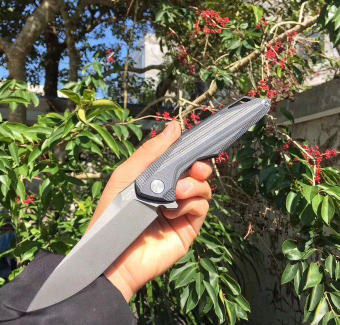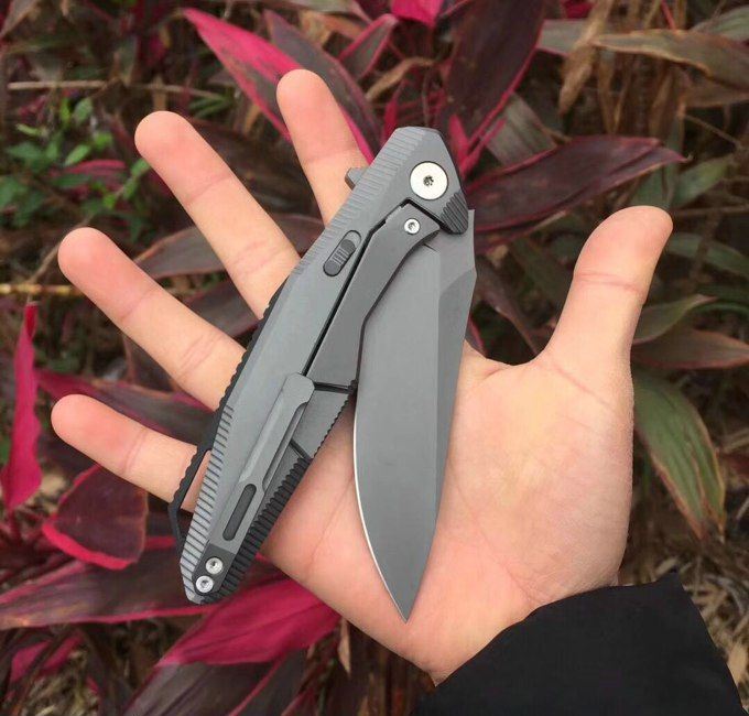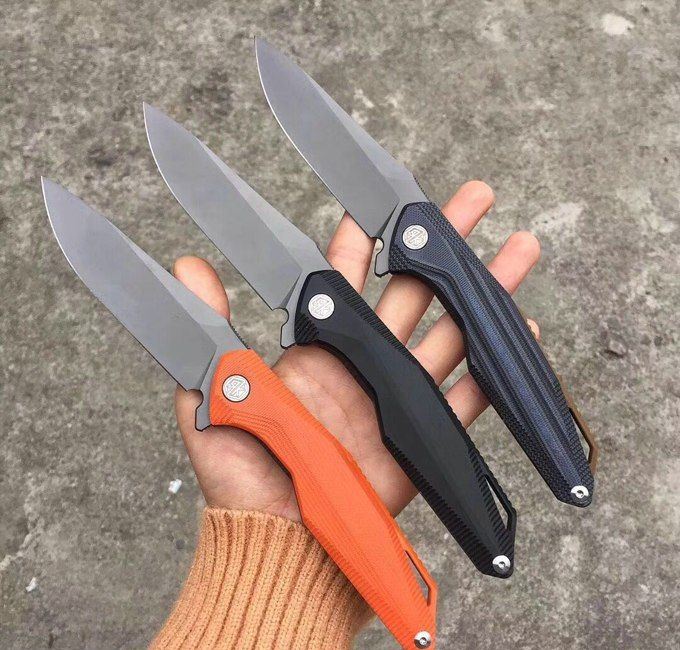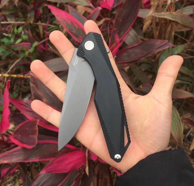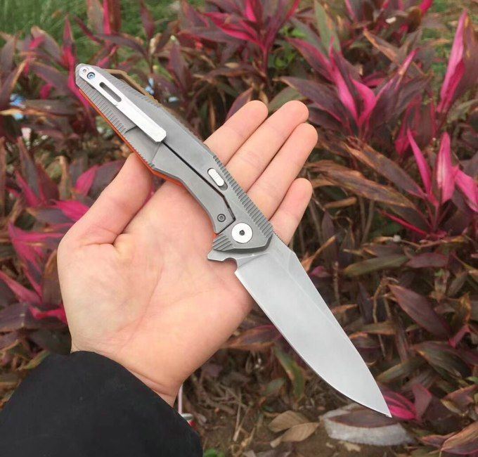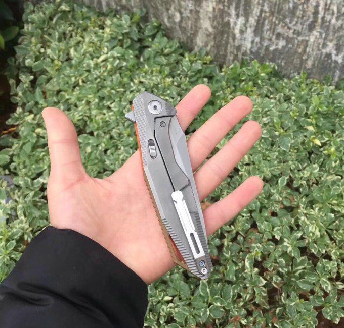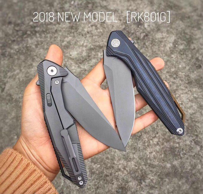 新款RK801G高端折刀 全长:22cm 刀刃长度:9.5cm 刀刃厚度:4mm 刀刃材质:154CM 刀刃形状:水滴头 刀刃硬度:HRC59-60 刀刃处理:PVD枪灰色 刀柄长度:12.5cm 刀柄厚度:1.3cm 刀柄材质:钛合金+G10 颜色:橘色/黑色/多色 重量:118g 轴承:陶瓷滚珠+垫片、快开