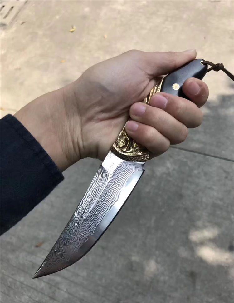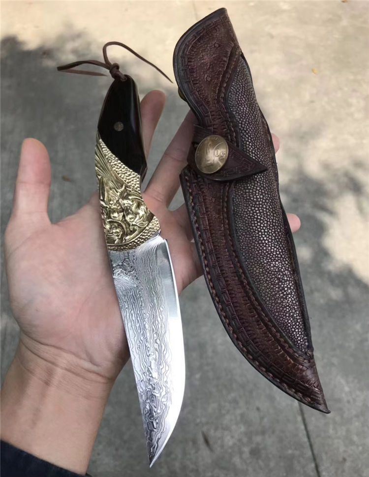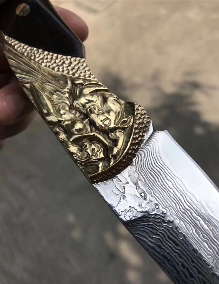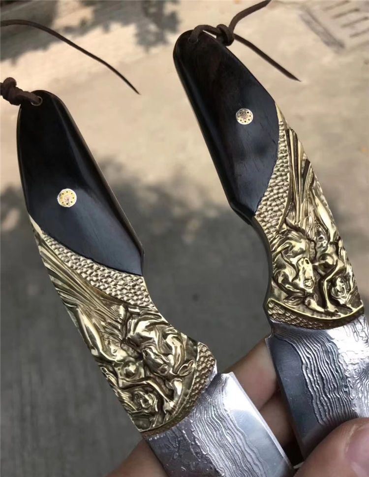 一体龙骨大马士革刀,亮点在于挡手地方采用纯黄铜手工精雕而成,立体感凹凸感很强!搭配进口黑檀木配花钉固定,刃材采用日本夹层大马士革钢VG10钢芯一体龙骨结构制作,锋利度超好!搭配进口纯手工植鞣皮镶嵌魔鬼鱼皮,每一针一线都是纯手工缝制!