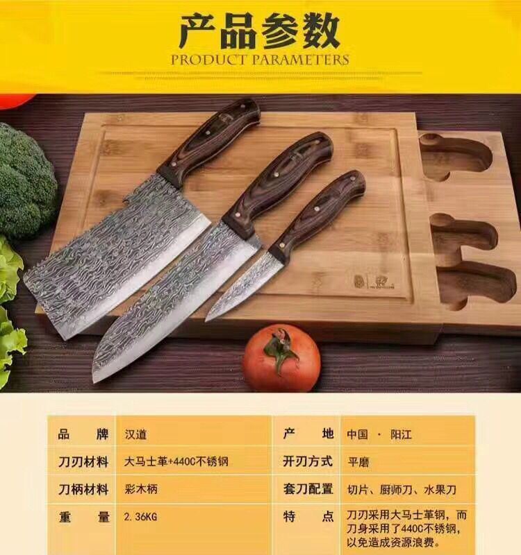 大马士革汉道三件套厨刀 汉道大马士革钢厨房套刀采用优质大马士革钢与440不锈钢完美结合,刀刃锋利坚韧,菜刀,厨师刀,削皮刀一套三刀,让你不管是居家下厨还是露营造饭都有一样顺手的下厨工具