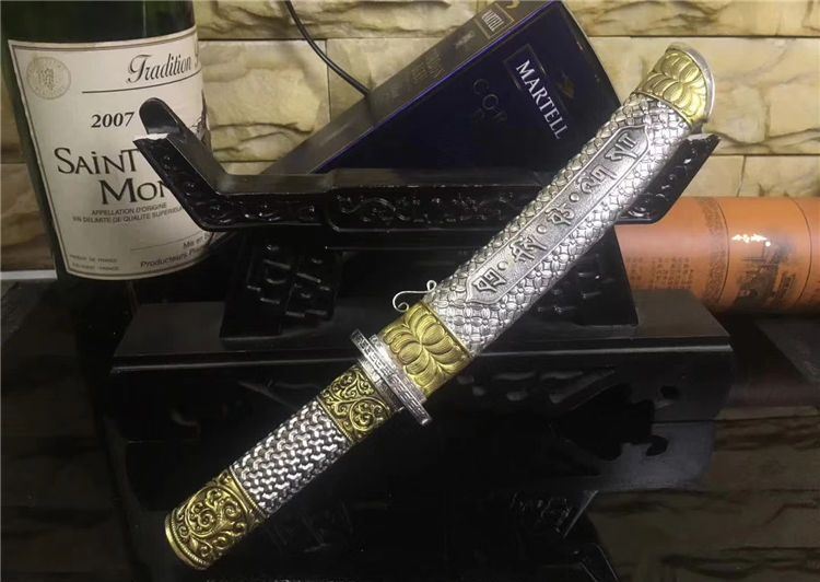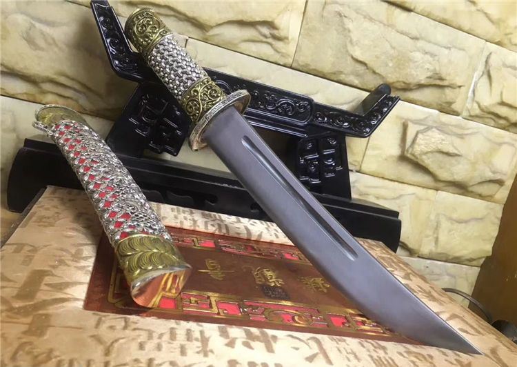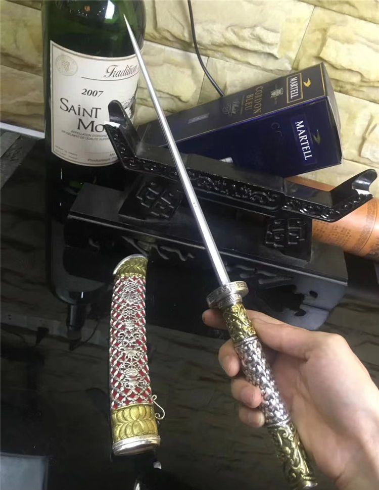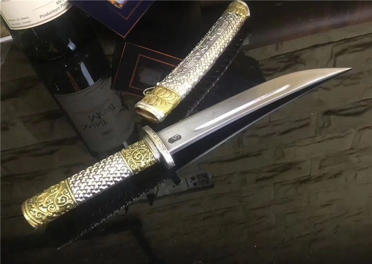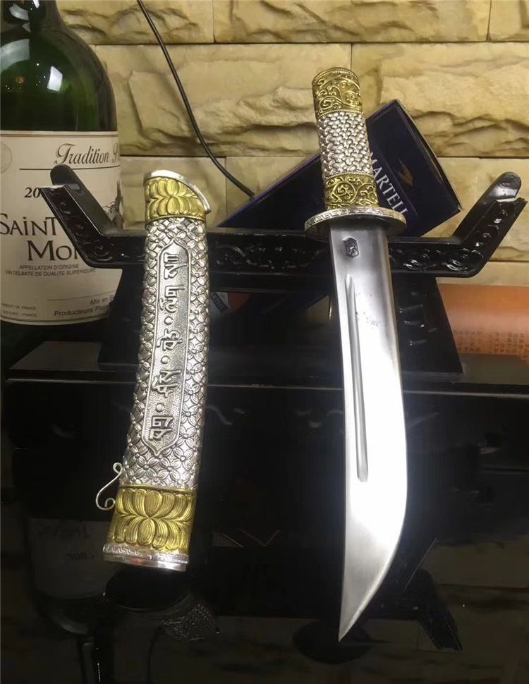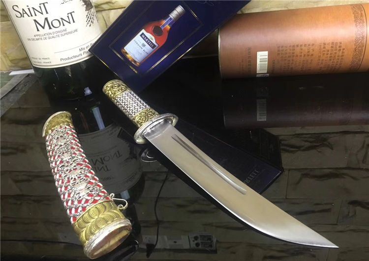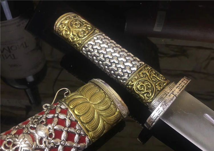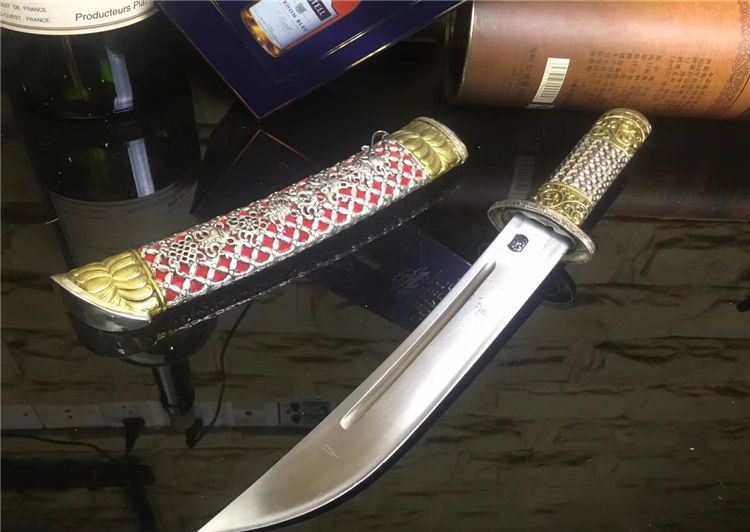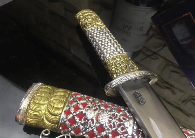 拉孜藏刀吉祥红莲 全长:40cm 刃长:24.5cm 柄长:15cm 刃宽:3.5cm 硬度:58-61HRC 重量:700g 柄材:白铜、黄铜 刃材:弹簧钢 鞘材:白铜、黄铜 工艺:藏区民间手工艺制作