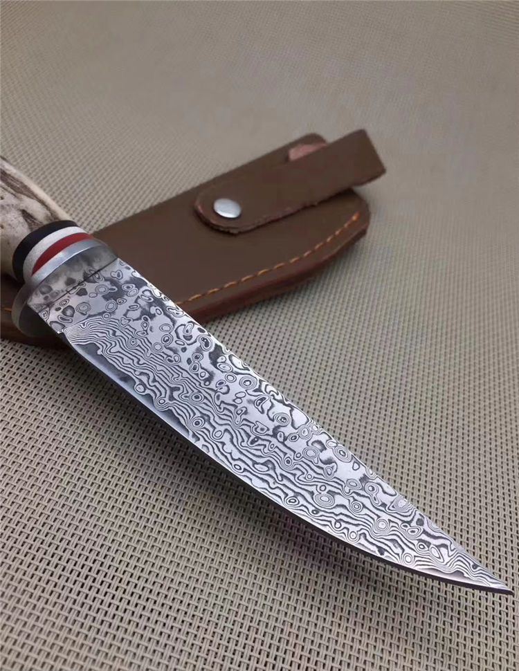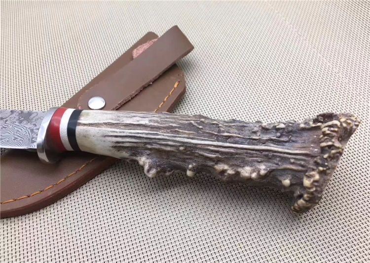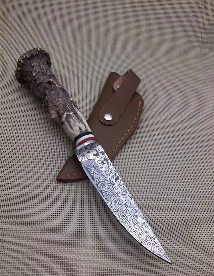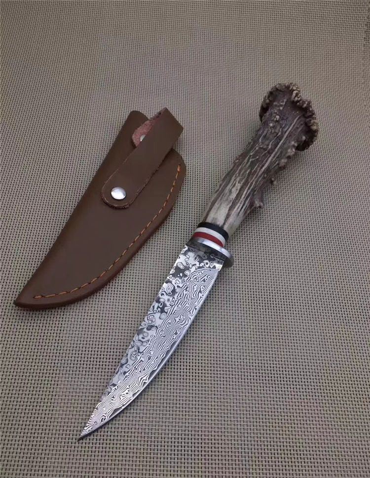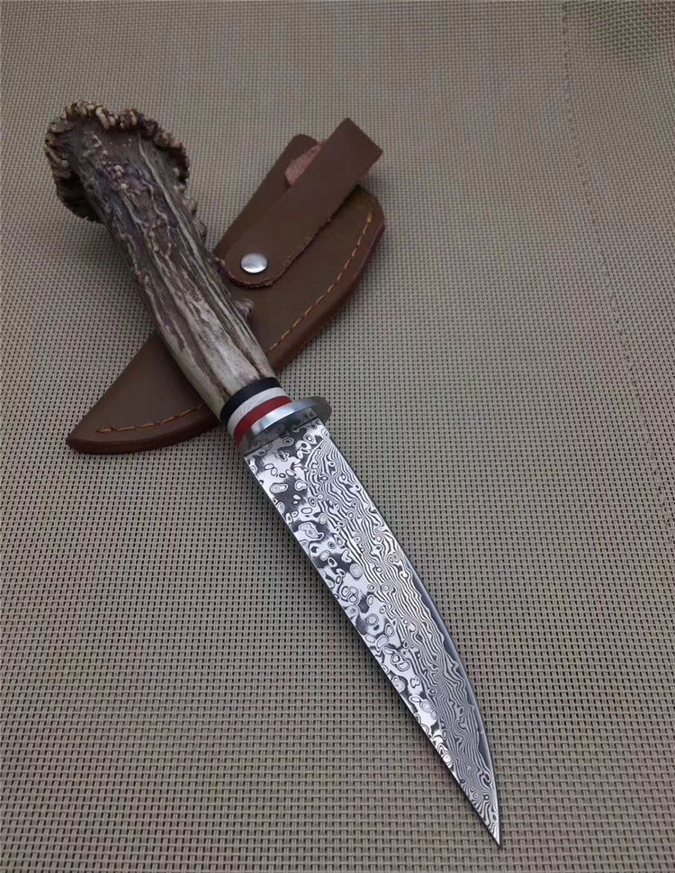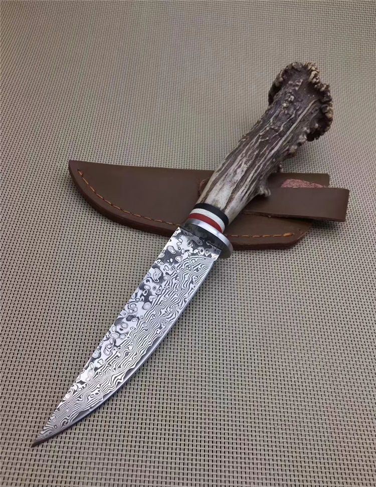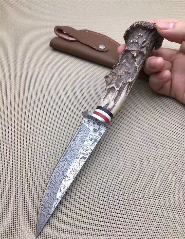 手工飞鹿大马士革直刀 全长:21.5cm 刃长:9.5cm 柄长:12.0cm 刃厚:0.38mm 刃宽:2.1cm 刃材:大马士革钢 硬度:58-60HRC 重量:约130克(含包装) 表面:锻打祥云纹原色 柄材:天然鹿角+G10 配送:高级礼品盒+皮套
