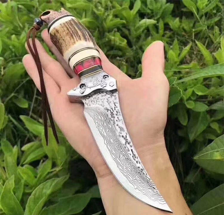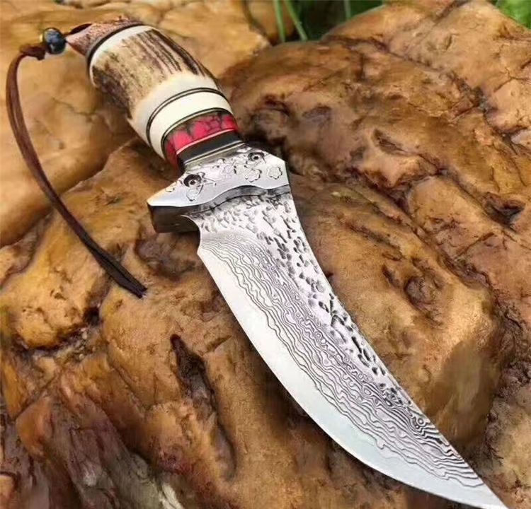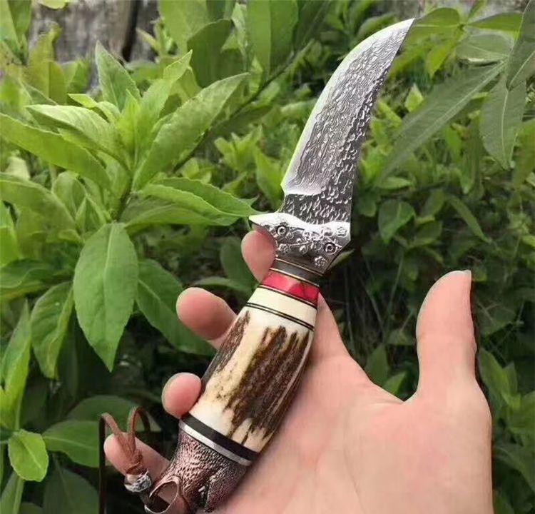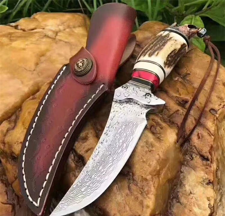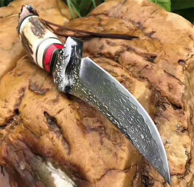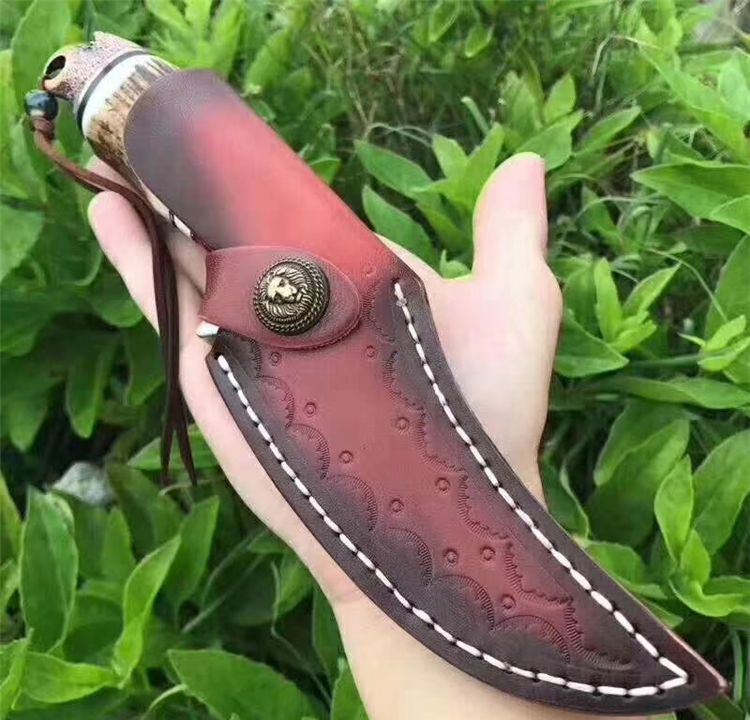神鹰大马士革直刀 全长:24.5cm 刃长:11.2cm 柄长:13.3cm 刃厚:3.8mm 刃宽:3.1cm 刃材:大马士革钢 硬度:59-60HRC 重量:约800克(含包装) 表面:锻打凹凸大马士革祥云纹原色 柄材:天然鹿角+不锈钢+彩石+神雕 配送:高级礼品盒+手工皮套