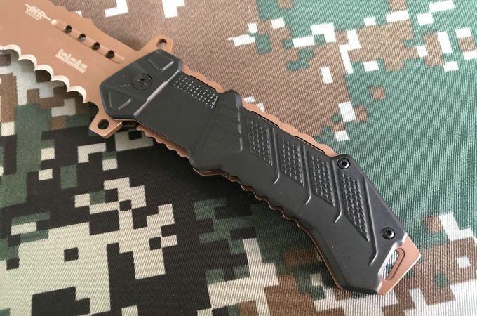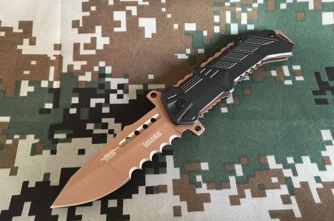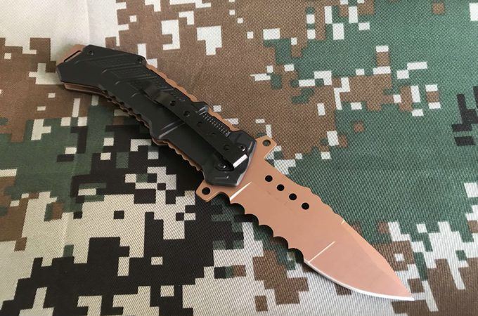 JKR战术折刀 全长:21.2cm 刃长:9.2cm 刃宽:3cm(最宽处) 刃材:5Cr13 硬度:57HRC 刃厚:0.28cm 柄长:12CM 表面:金 柄材:铝加钢 重量:250克