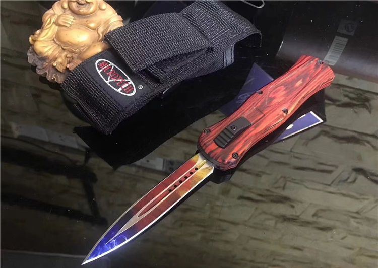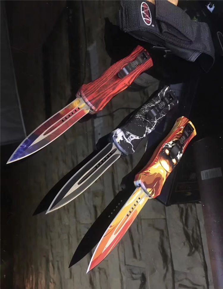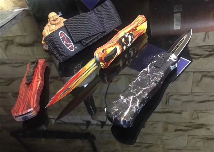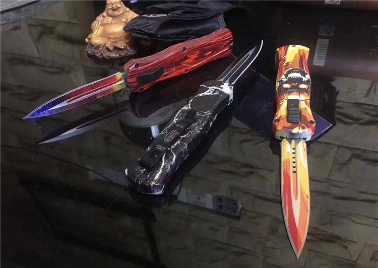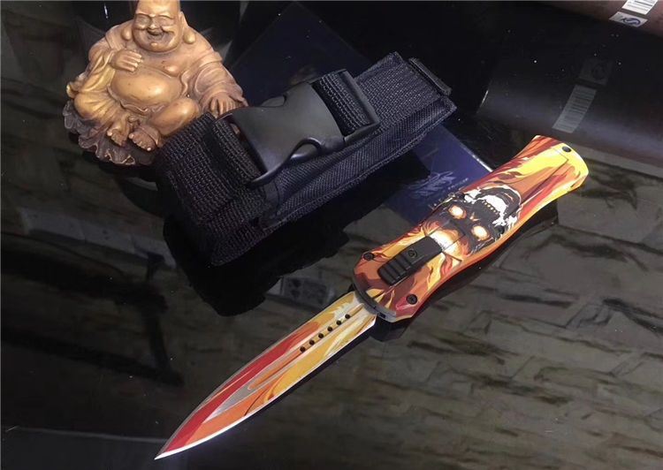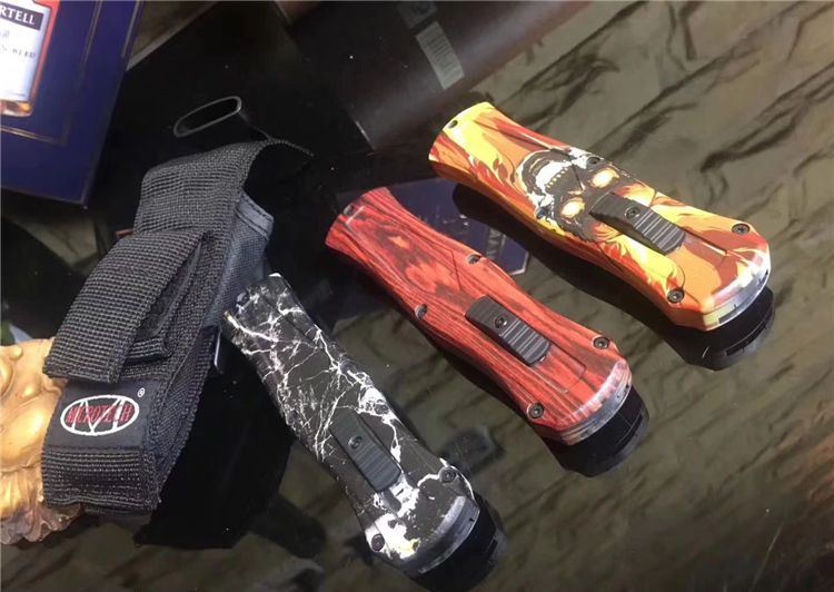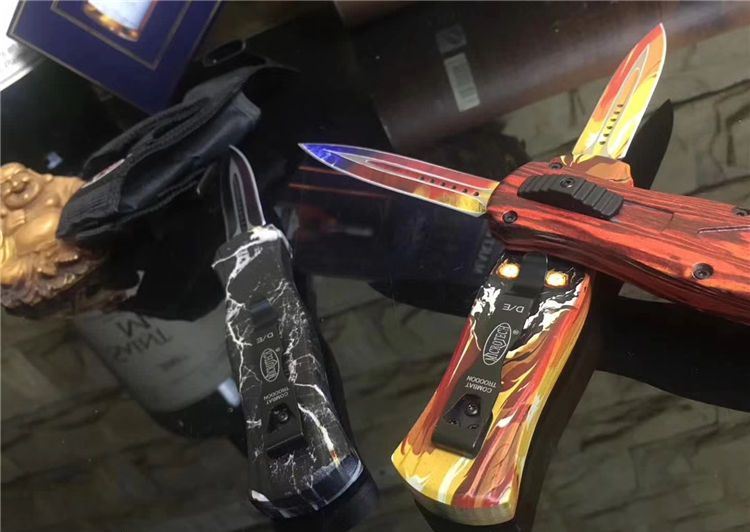 微技术火焰直出跳刀 品牌:微技术 全长:22cm 刃长:9.2cm 刃厚:2.8mm 刃材:440 硬度:57HRC 刀重:291g 毛重:401g 表面:氧化黑 柄材:锌铝合金 刀鞘:尼龙 锁闭:直出弹簧刀 三色可选:X3火焰 X4木纹 x5闪电