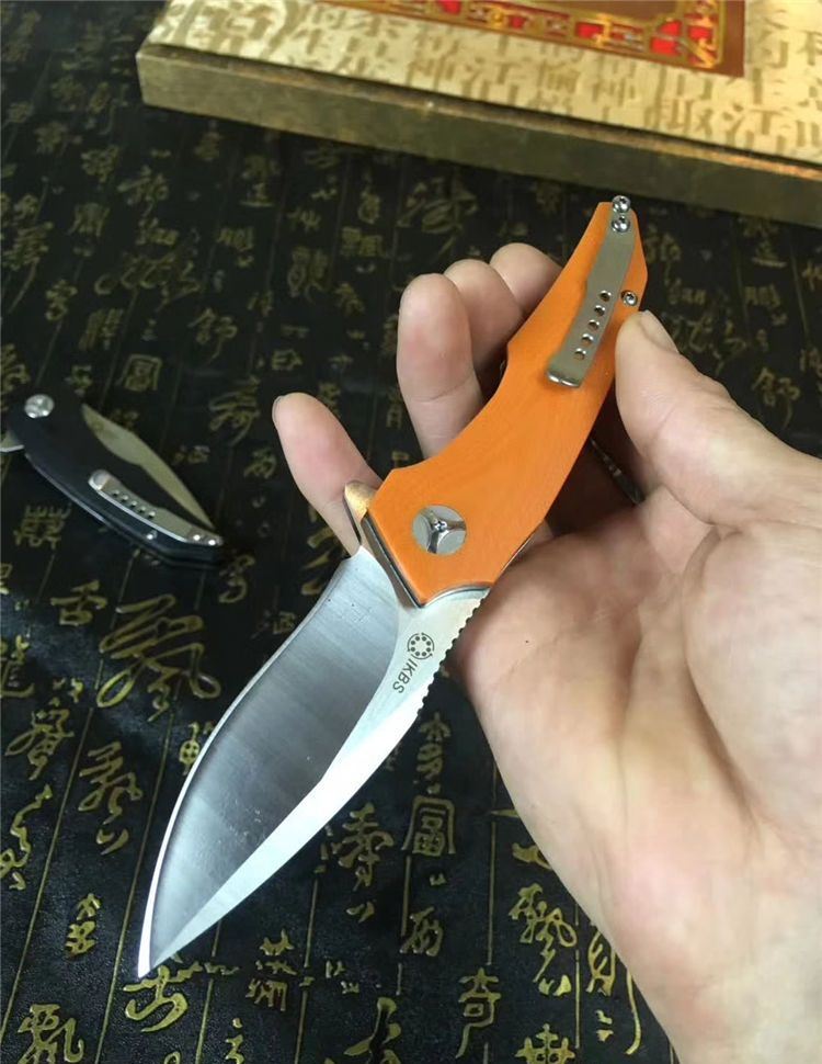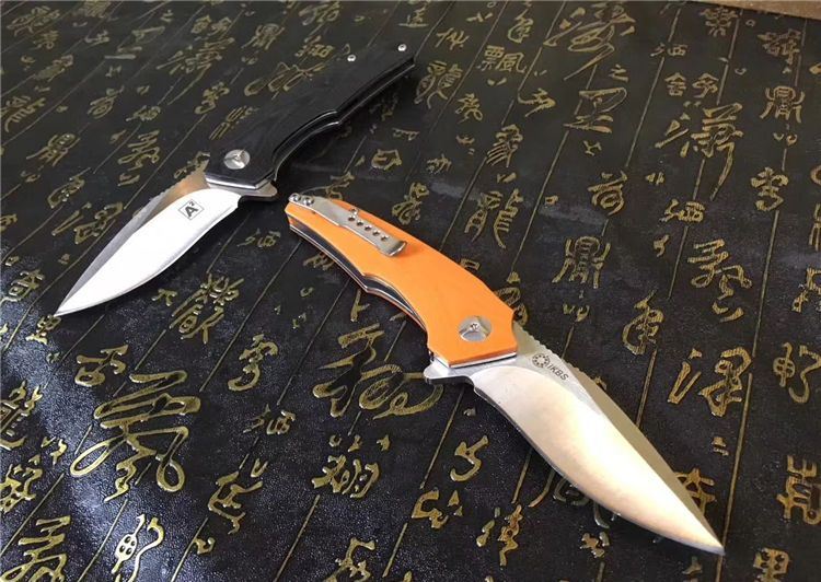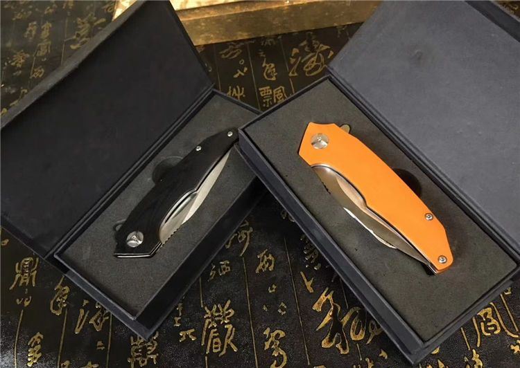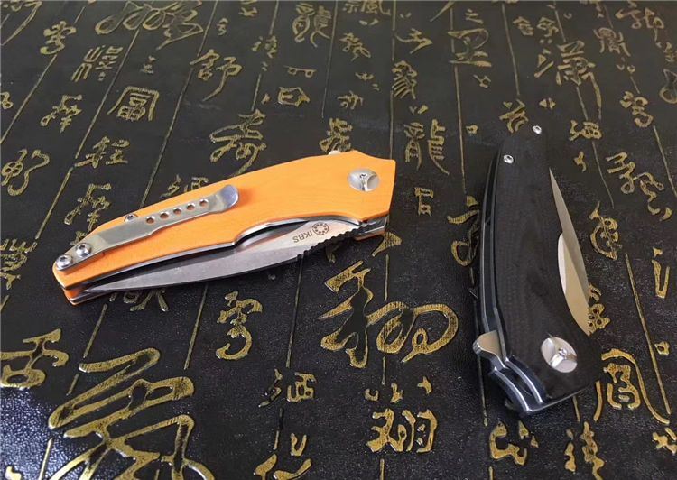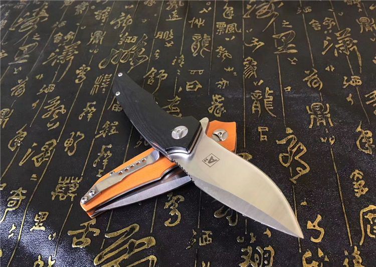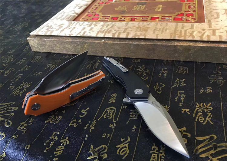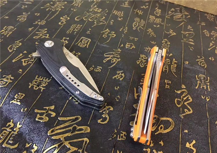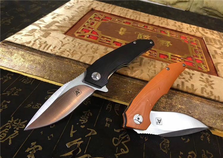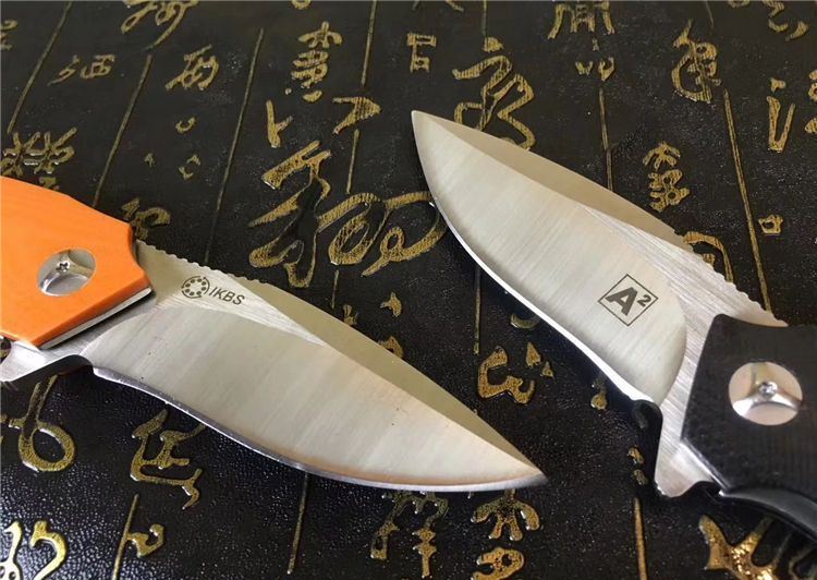 A2轴承快开折刀 全长:18.5cm 刃长:8cm 柄长:10.5cm 刃材:440c 硬度58-59 柄材:黑色G10+钢柄 滚珠轴承开合设计 礼品盒+牛津套+螺丝起子