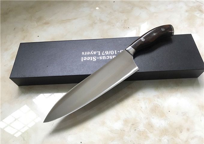 日本进口无敌锋利VG10钢-8寸厨刀 全长:32.5cm 刃长:20cm 刀宽:5.1cm 刃钢材:日本进口纯VG10 硬度:60HRC 刃厚度:2mm 手柄材料:黄金檀+不锈钢头 包装:高级AV礼品盒 本刀采用日本进口纯VG10制作,具有硬度高,防锈性能好,韧性好的特点。以达到优异的锋利度和切削效果。 刀柄采用天然黄金檀,手感更加舒适美观!配送礼品盒,居家送礼之精品