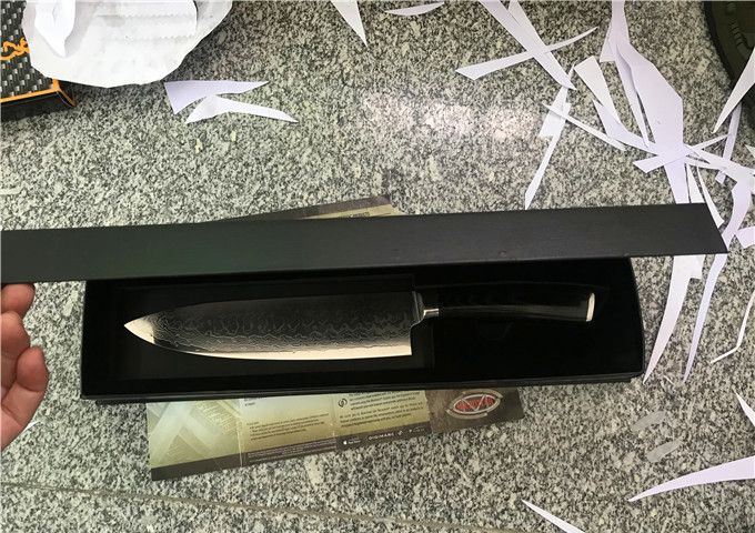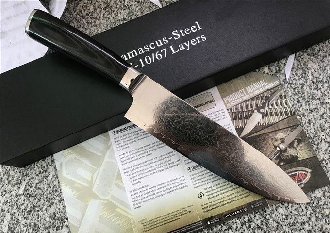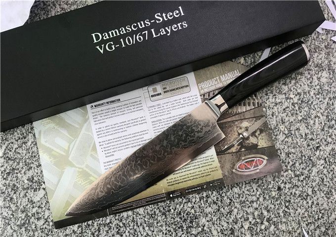 日本大马士革钢VG10-8寸厨刀米卡塔鱼骨纹 全长:32.8cm 刃长:20cm 刀宽:4.6CM 刃钢材:大马士革钢 硬度:60HRC 刃厚度:2mm 手柄材料:米卡塔+不锈钢头 包装:高级AV礼品盒 本刀采用进口VG-10大马士革钢锻造制作,具有硬度高,防锈性能好,韧性好的特点。以达到优异的锋利度和切削效果。刀柄采用米卡塔,手感更加舒适美观!配送礼品盒,居家送礼之精品!