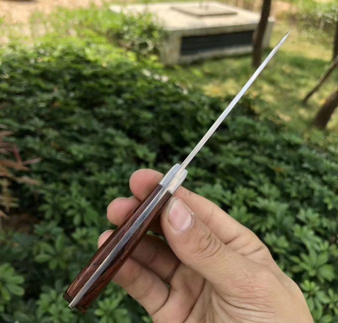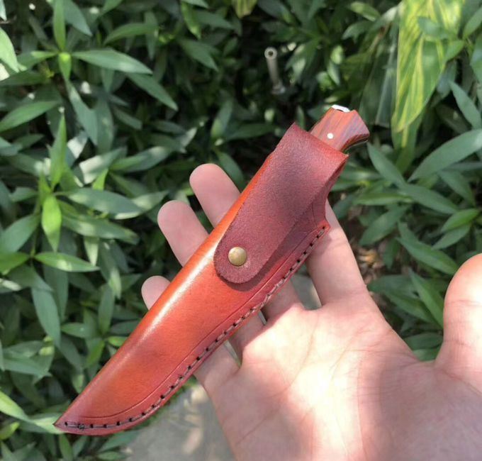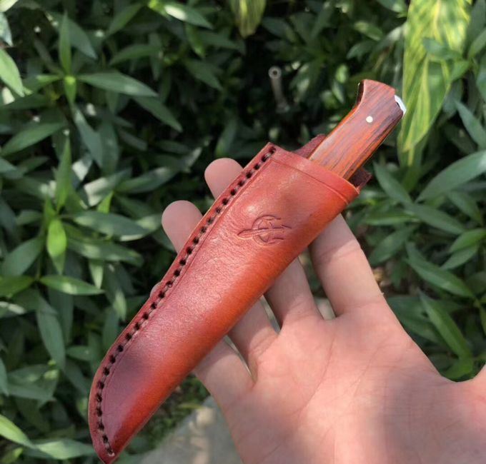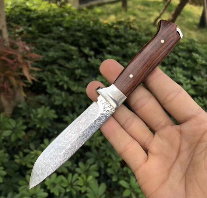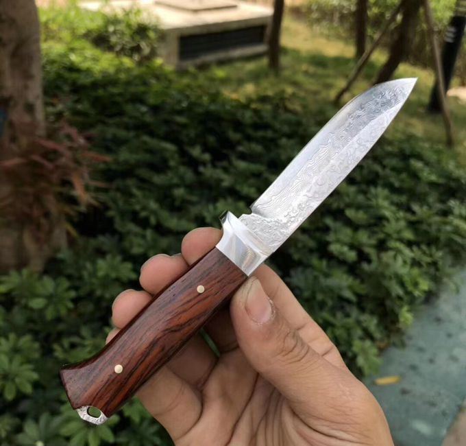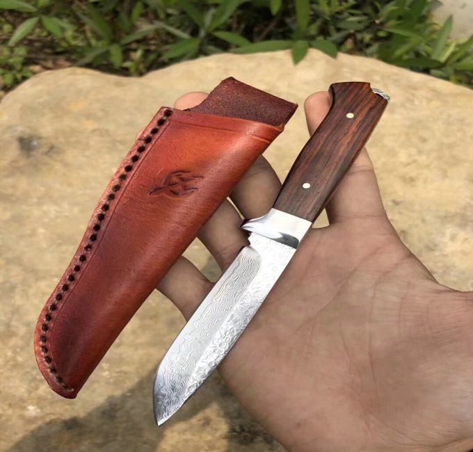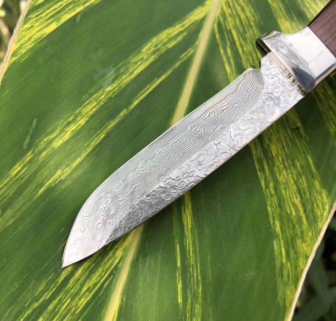 大马士革和字水果刀 总长:18cm 刃长:8.6cm 刃厚:3mm 刃宽:2cn 钢材:夹层大马士革钢,(带钢芯)、一体龙骨设计,67层,真空热处理 硬度:60HRC 柄材:微粒黄檀木 皮套:进口植鞣皮