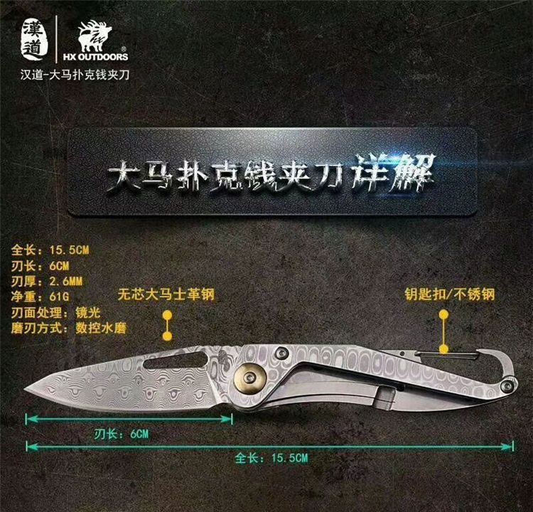 汉道大马士革扑克钱夹刀 全长:155mm 刃长:60mm 柄长:98mm 刃厚:2.6mm 刃材:无芯大马士革钢 柄材:不锈钢(CNC精细加工) 硬度:58HRC 刃面:大马士革原纹 极致轻量,时尚便携,该刀以无芯大马士革钢、不锈钢为用材经CNC精细加工制作,刃、柄设计精简,美观大方,轻量时尚,刃面镜光处理,数控水磨开刃规整锋利,柄尾设计简易钥匙扣,易悬挂便携