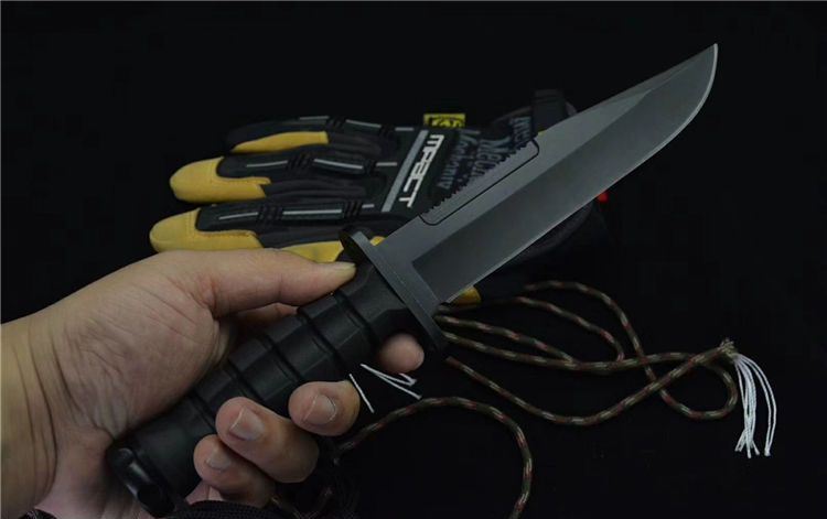 外贸US户外战术直刀 类型:直刀 全长:30.5cm 刃长:17.5cm 刃宽:3.5cm(最宽处) 刃厚:3.8mm 柄长:11.8cm 表面: 发黑 刃材: 8CR13 硬度: 58HRC 柄材: ABS纤维塑料 重量: 344克(含包装) 包装:尼龙套、手柄带挂绳