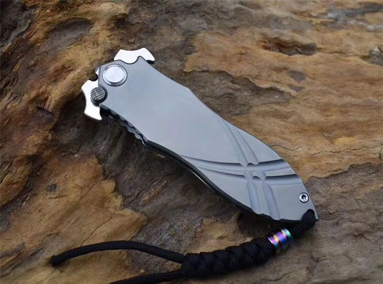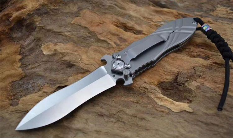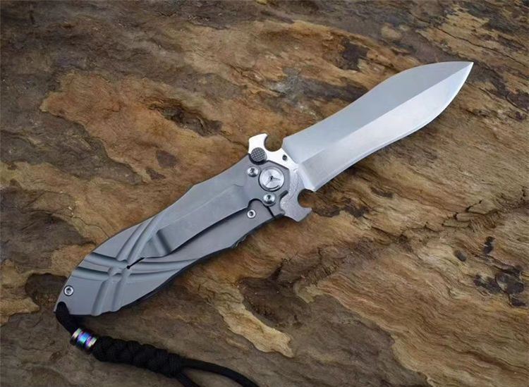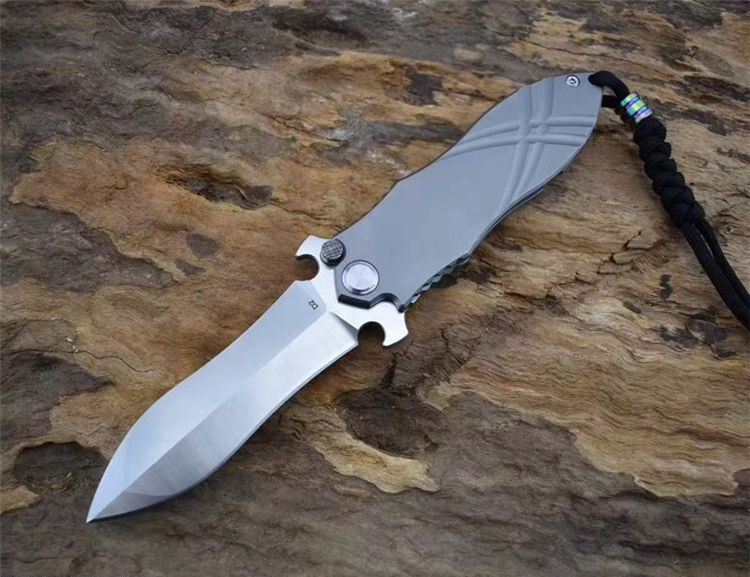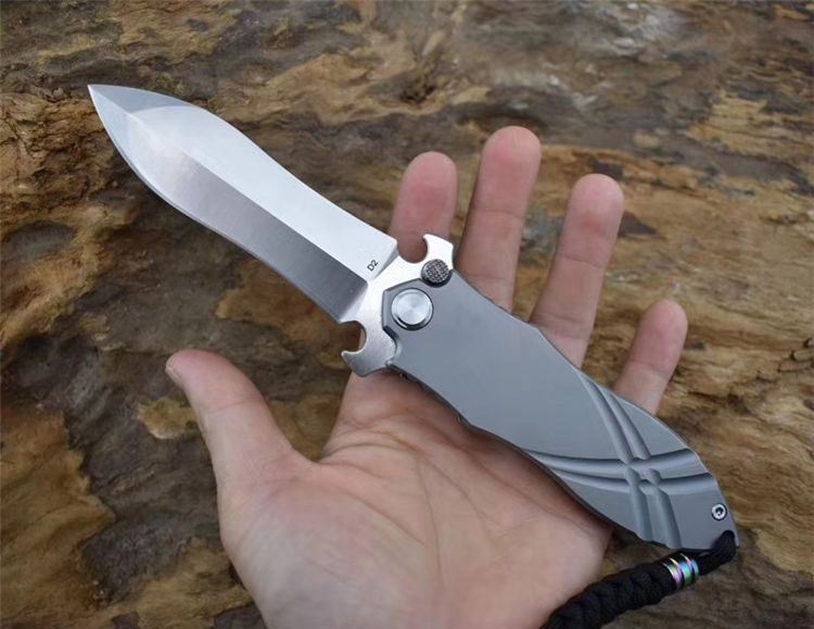 D2钛柄轴承双锋侠快开折刀 全长:220mm 刃长:95mm 刃厚:3.8mm 刃宽:30mm 刃材:D2 表面:精细砂光 柄材:TC4钛合金 硬度:58~60HRC 重量:153g 折叠:陶瓷滚珠轴承快开 备注:配伞绳钛合金刀坠+1米伞绳
