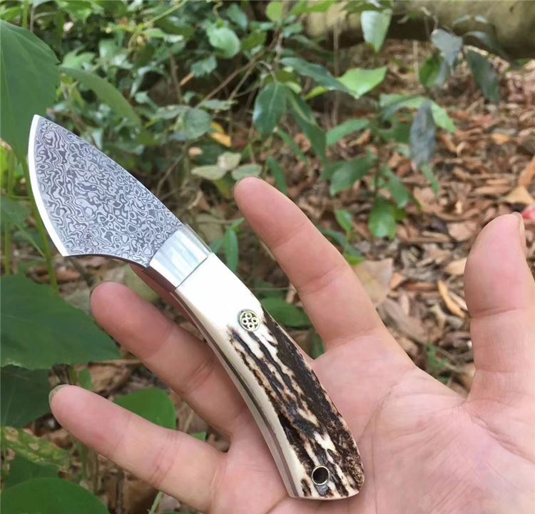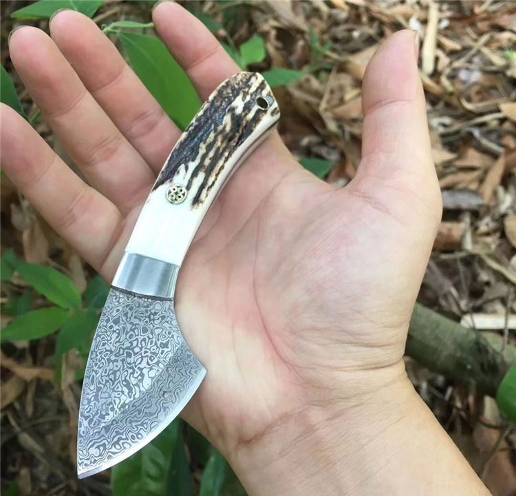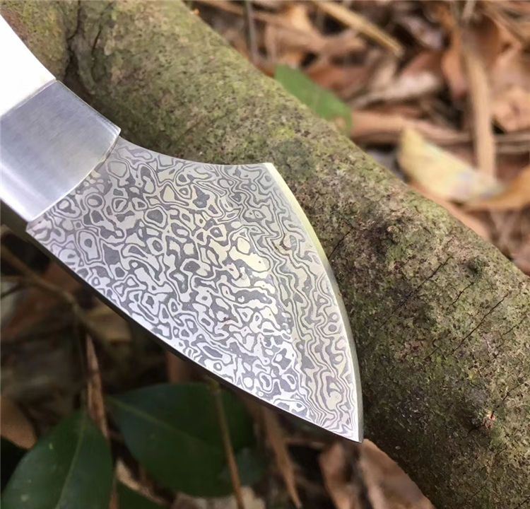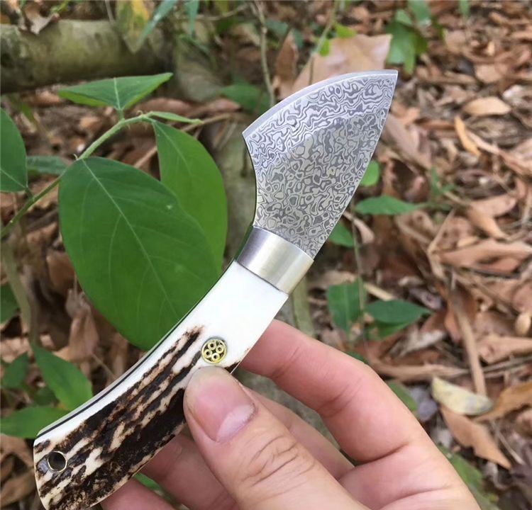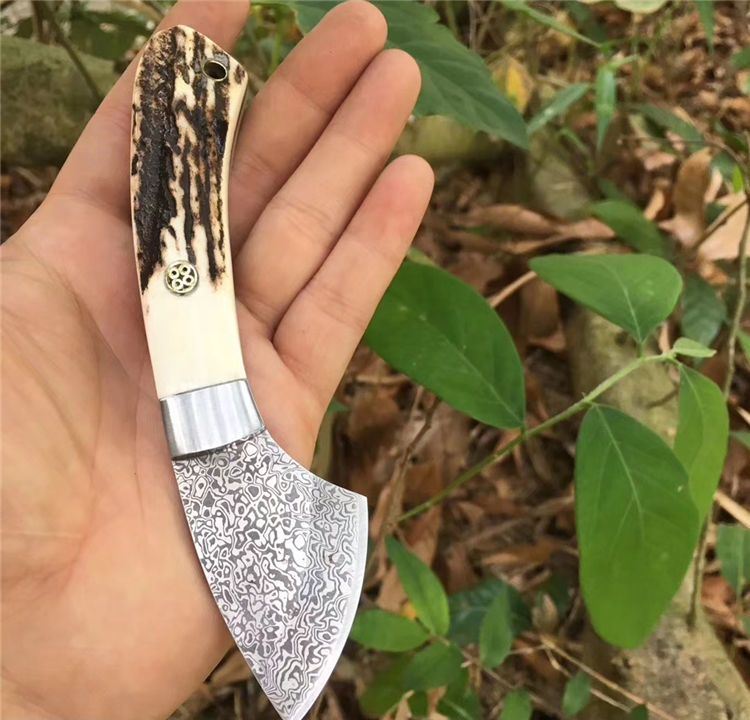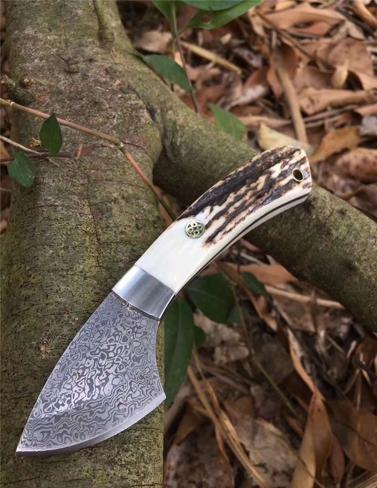 大马士革小袋鼠直刀 全长: 15.2cm 刃长: 5.2cm 刃宽: 2.5cm(最宽处) 柄长: 10cm 硬度: 58HRC 刃厚: 0.25cm 重量: 100克 表面: 纯手工制造 刃材: 大马士革 柄材: 鹿角 全手工精心打造经典中的经典高端鹿角香刀,每一款鹿角都不一样、以实物为准