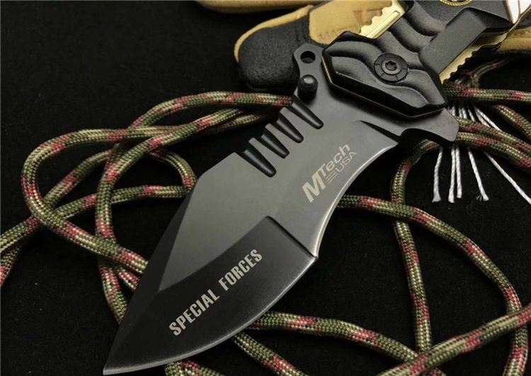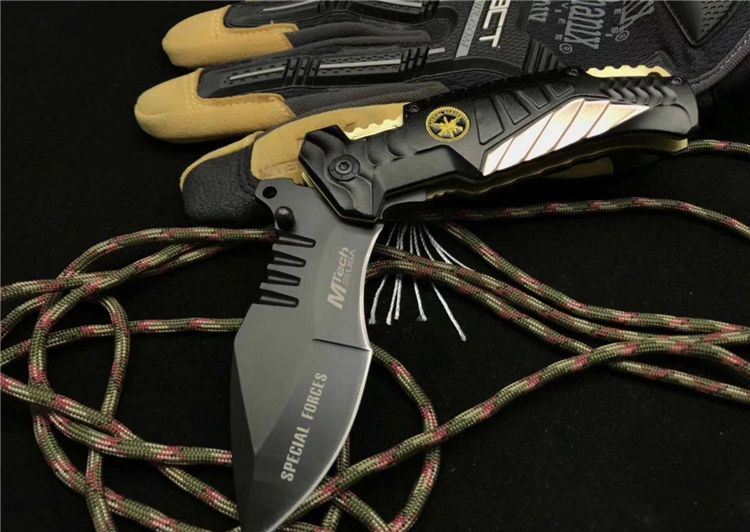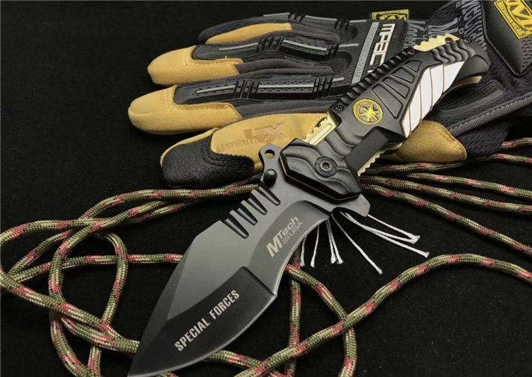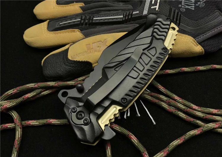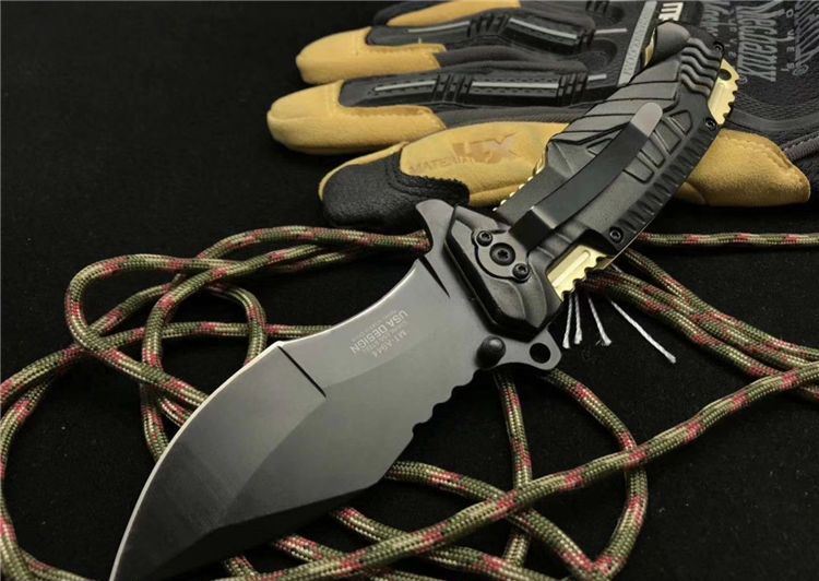 外贸版MT-A944折刀 全长:21.0cm 刃长:9.0cm 柄长:12.0cm 刃宽:3.8cm最宽处 刃厚:0.3cm 刃材:5CR13MOV 重量:217g 硬度:57HRC 表面:氧化黑 柄材:铝 其他:配黑盒