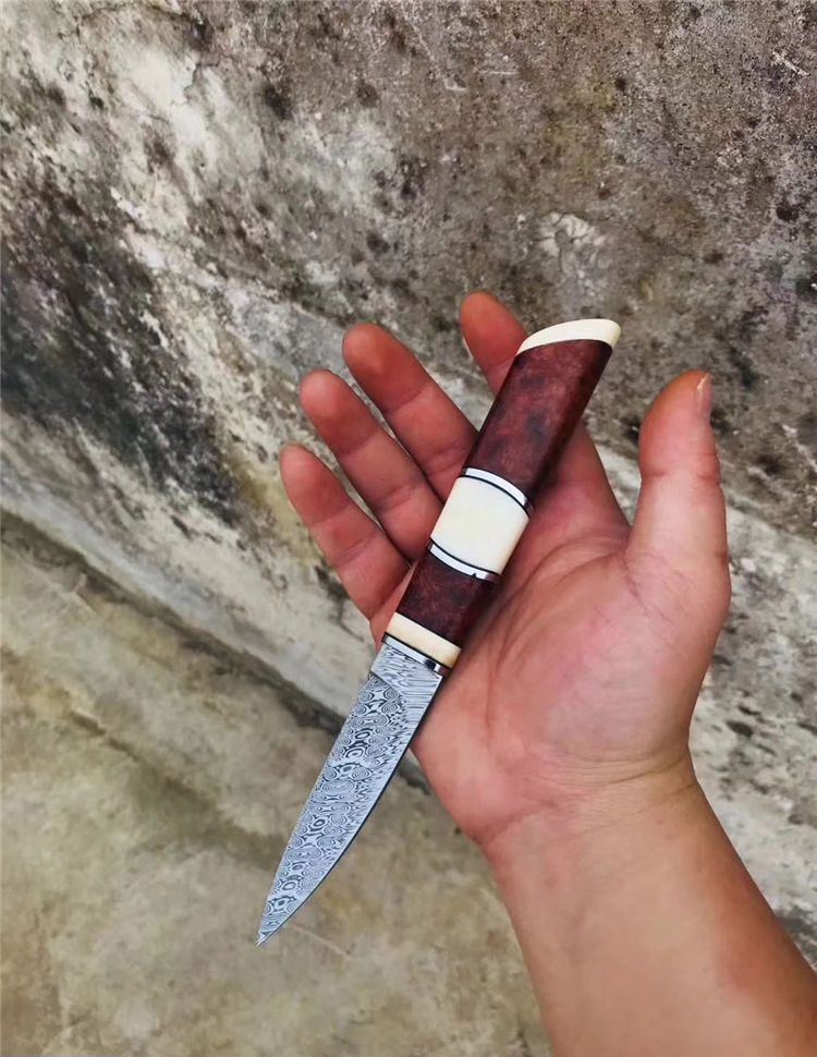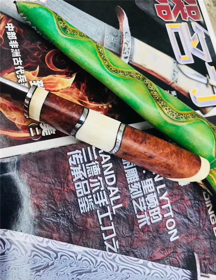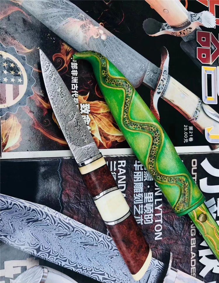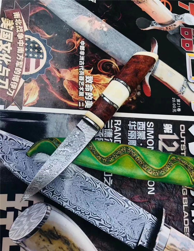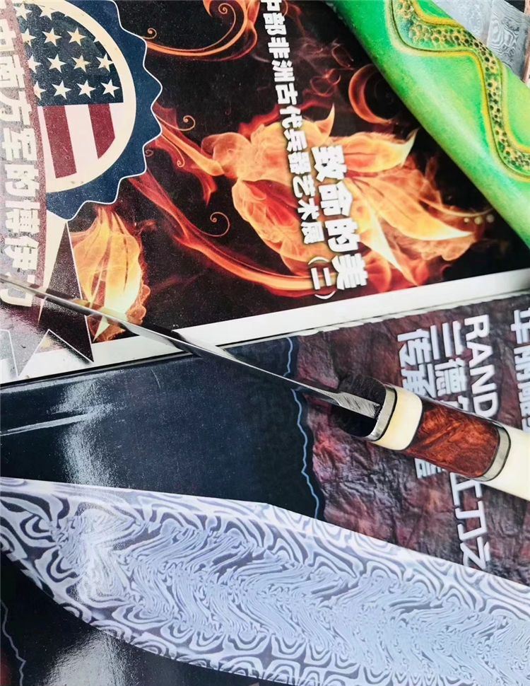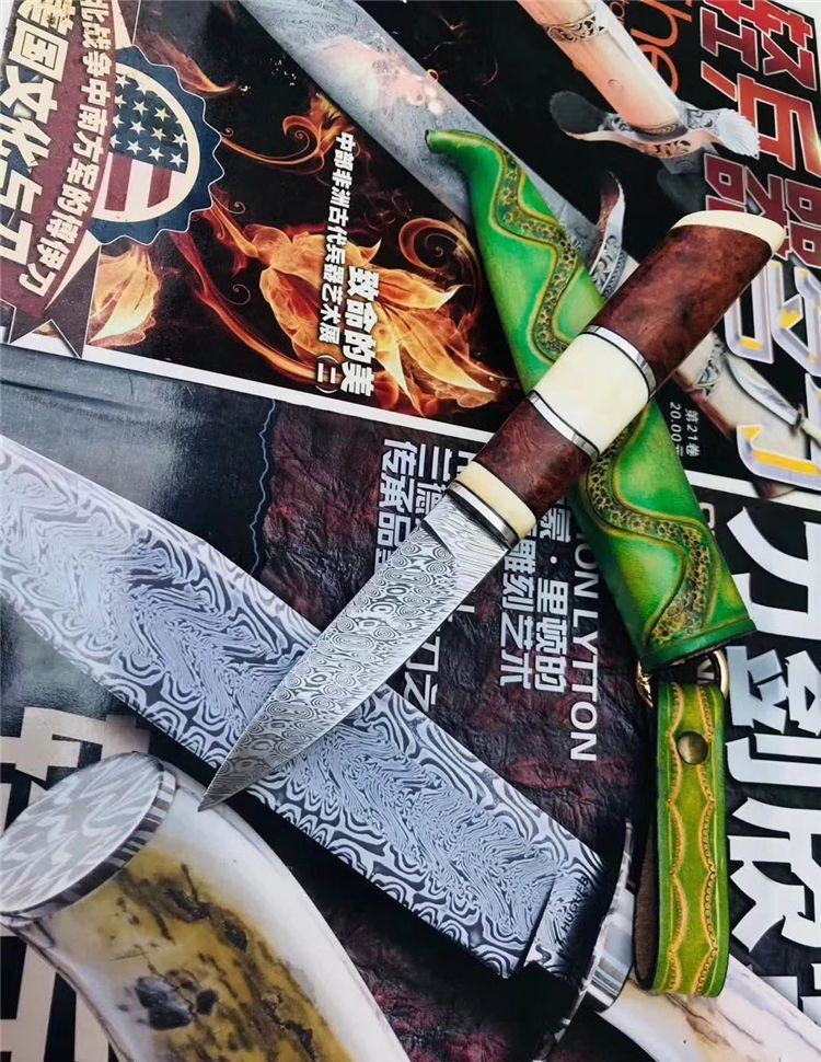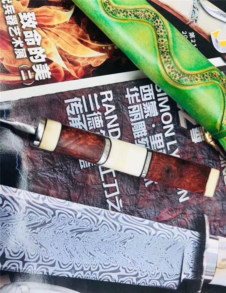 瑞芬火焰纹大马士革直刀 全长:200mm 刃长:90mm 刃宽:20mm 刃厚:3.5mm 材料:进口瑞典瑞芬火焰纹 硬度:60-61 海鸥海象牙+猛犸牙系列 配手工皮套 小清新皮套拉线欧式风格, 手柄材料搭配海象牙+猛犸牙+大马隔片+缅甸花梨瘤+黑钢纸隔片预定版