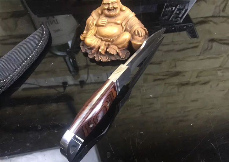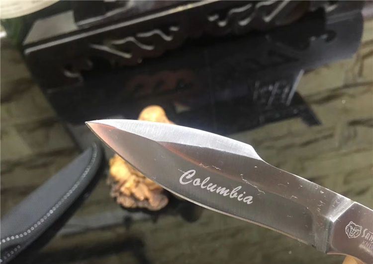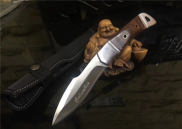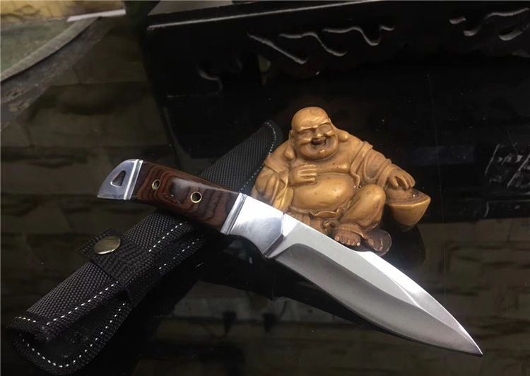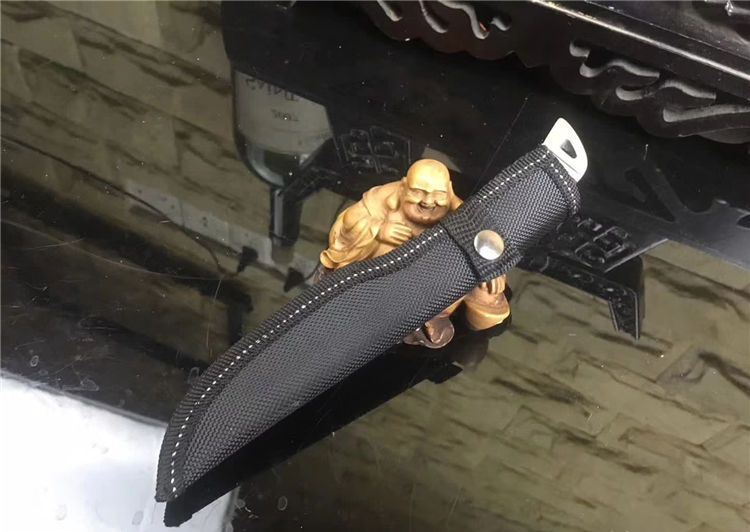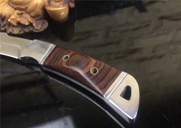 k90-圆头小猎刀 全长: 210cm 刃长: 10.5cm 宽: 3.3cm(最宽处) 柄长: 106cm 刃厚: 0.31cm 刃材: 5Cr13Mov 硬度: 56RHC(高硬度) 净重: 234克(含套) 表面: 砂光 柄材: 钢头+彩木 其他:尼龙套